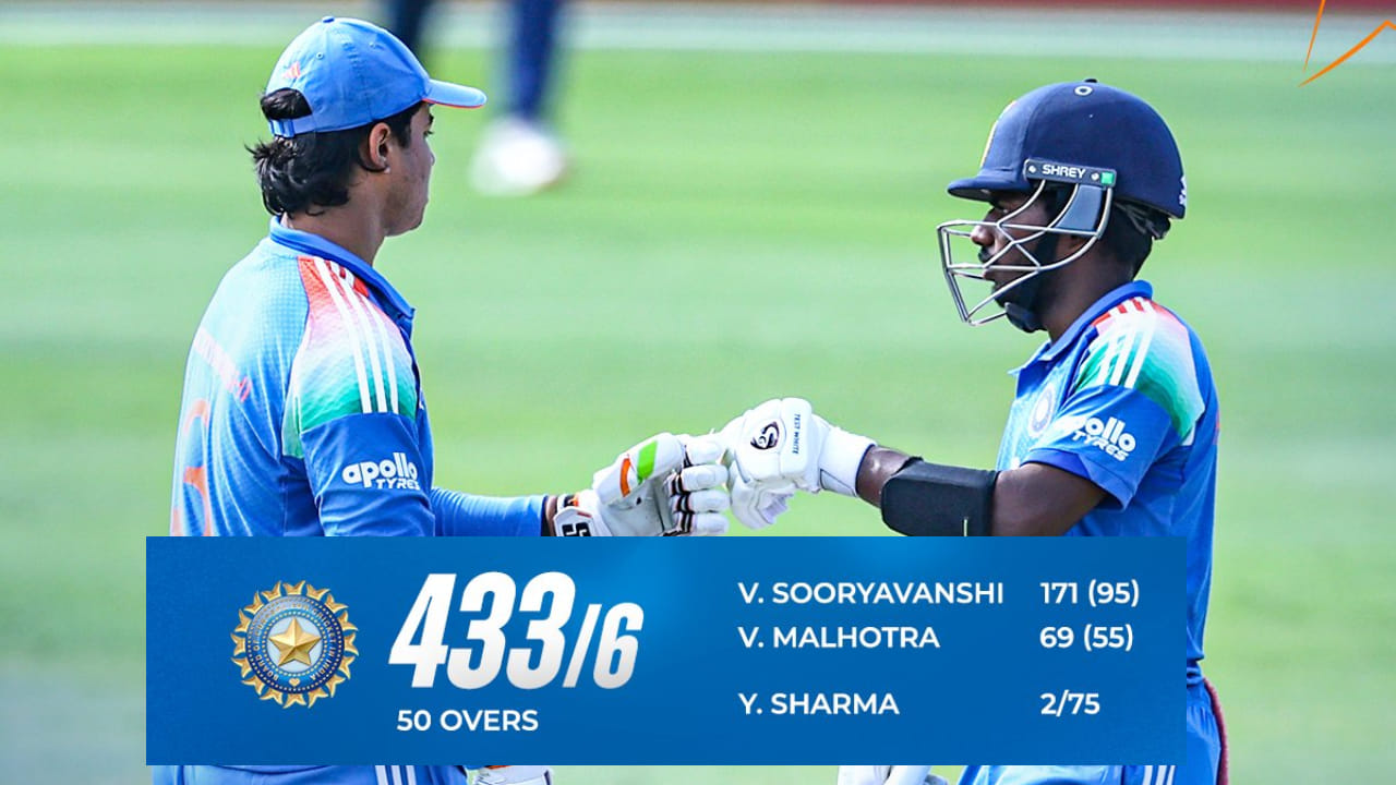 ಟೀಂ ಇಂಡಿಯಾ ಇಷ್ಟು ಬೃಹತ್ ಮೊತ್ತ ಕಲೆಹಾಕುವಲ್ಲಿ ಪ್ರಮುಖ ಪಾತ್ರವಹಿಸಿದ ತಂಡದ ಆರಂಭಿಕ ಆಟಗಾರ 14 ವರ್ಷದ ವೈಭವ್ ಸೂರ್ಯವಂಶಿ ಸಿಡಿಲಬ್ಬರದ ಶತಕ ಸಿಡಿಸಿದರು. ಮಾತ್ರವಲ್ಲದೆ, ಯುವ ಏಕದಿನ ವೃತ್ತಿಜೀವನದ ಅತಿದೊಡ್ಡ ಇನ್ನಿಂಗ್ಸ್ ಆಡಿದರು. ಈ ಪಂದ್ಯದಲ್ಲಿ ಆರಂಭಿಕರಾಗಿ ಕಣಕ್ಕಿಳಿದ ವೈಭವ್ ಸೂರ್ಯವಂಶಿ ಕೇವಲ 56 ಎಸೆತಗಳಲ್ಲಿ ಶತಕ ಬಾರಿಸಿದರು.