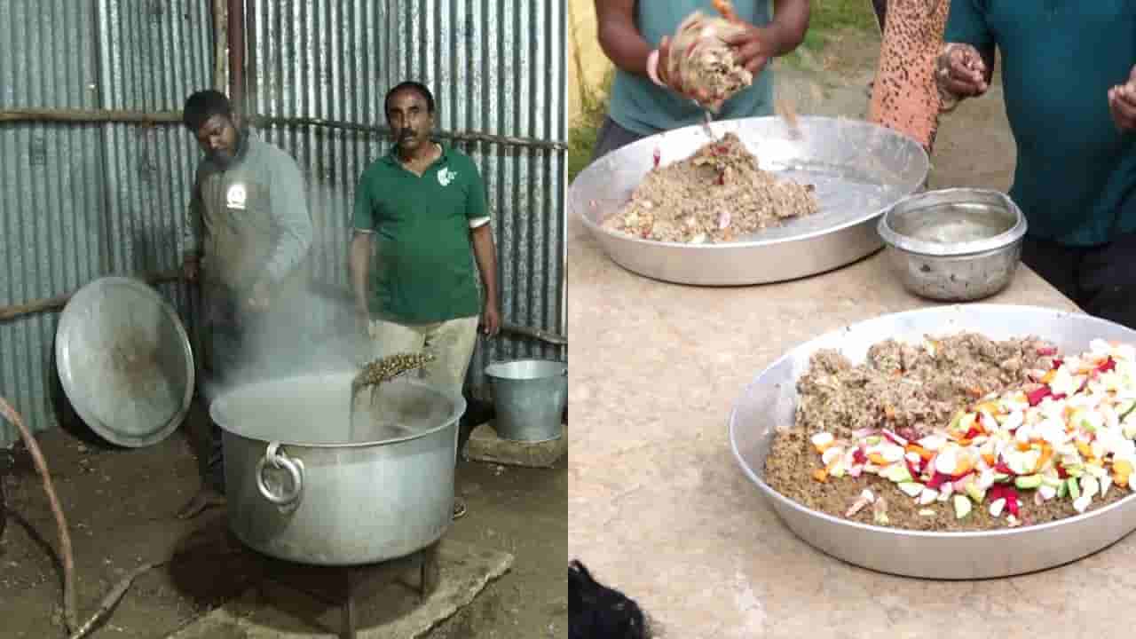 ಇದು ದಸರಾ ಗಜಪಡೆಗೆ ನೀಡುತ್ತಿರುವ ಅದ್ಧೂರಿ ಭೋಜನ. ಹಲವು ಬಗೆ ಕಾಳುಗಳನ್ನು ಬೇಯಿಸಿ, ಬೆಣ್ಣೆ, ತರಕಾರಿ ಜೊತೆಗೆ ಮುದ್ದೆ ಮಾಡಿ ಆನೆಗಳಿಗೆ ಕೊಡಲಾಗುತ್ತಿದೆ. ಇದರ ರುಚಿಗೆ ಆನೆಗಳು ಸಖತ್ ಖುಷಿಯಾಗಿವೆ. ಉದ್ದಿನ ಕಾಳು, ಹೆಸರು ಕಾಳು, ಗೋದಿ, ಕುಸುಬಲಕ್ಕಿಯನ್ನು ಸುಮಾರು ಮೂರರಿಂದ 4 ತಾಸು ಚೆನ್ನಾಗಿ ಬೇಯಿಸಲಾಗುತ್ತದೆ. ಇದನ್ನು ಉಂಡೆ ಮಾಡಿ ಪ್ರತಿದಿನ ಬೆಳಿಗ್ಗೆ ಸಂಜೆ ನೀಡಲಾಗುತ್ತಿದೆ.