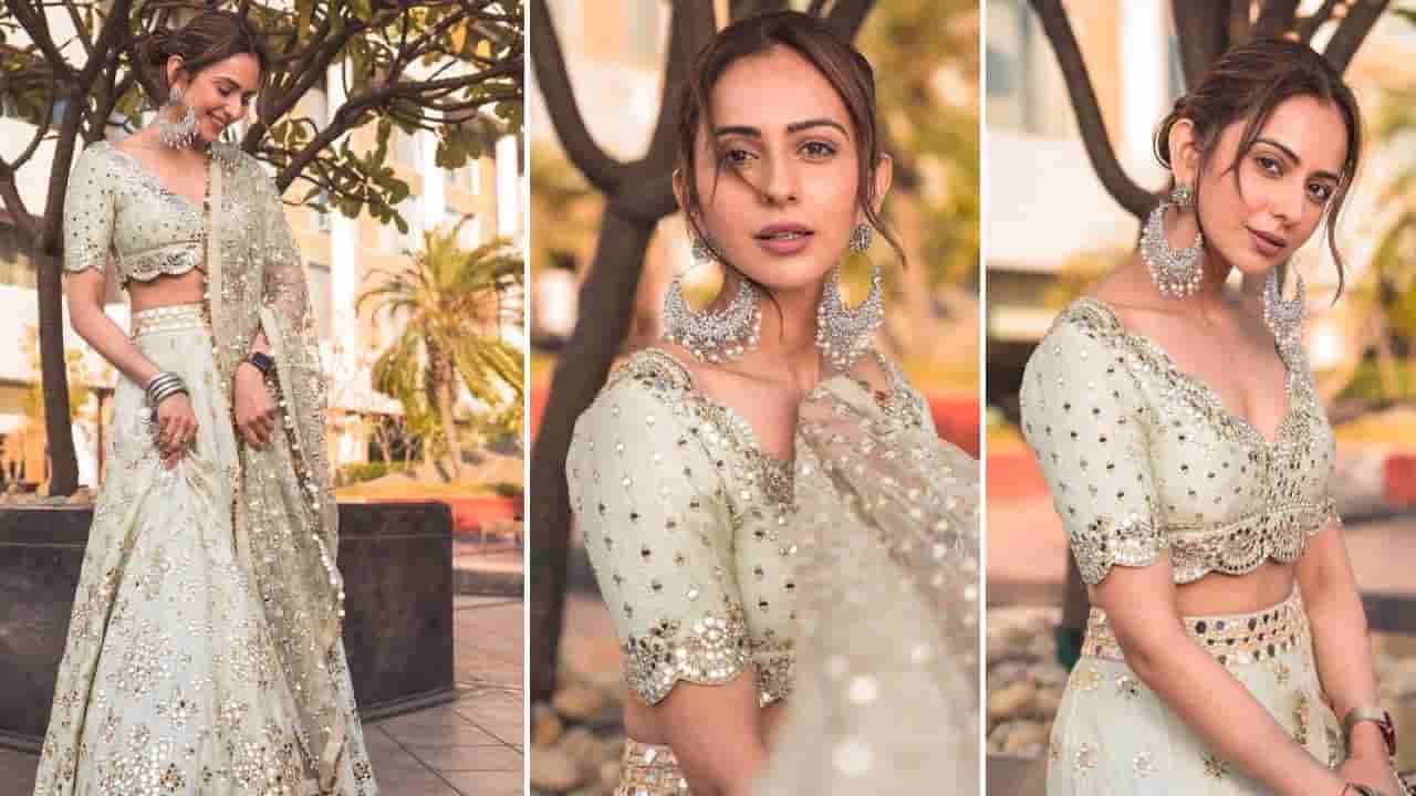 ಬಳಿ ಸಿಲ್ವರ್ ಬಣ್ಣದ ಲೆಹೆಂಗಾ ಧರಿಸಿದ್ದು, ಸಾಂಪ್ರದಾಯಿಕವಾಗಿ ಕಂಗೊಳಿಸಿದ್ದಾರೆ. ಗಾಳಿಯೂ ನಿಮ್ಮ ಮುಖವನ್ನು ಚುಂಬಿಸಲಿ ಎಂದು ಫೋಟೋಕ್ಕೆ ಕ್ಯಾಪ್ಷನ್ ನೀಡಿದ್ದಾರೆ. (Image Credit: Rakul Preet Singh Instagram)