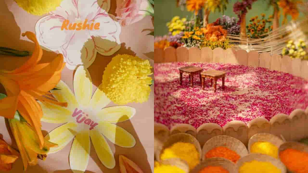 ಹಳದಿ ಶಾಸ್ತ್ರಕ್ಕಾಗಿ ವಿಶೇಷ ಥೀಮ್ಗಳೊಂದಿಗೆ ವೇದಿಕೆ ಸಿದ್ಧಪಡಿಸಲಾಗಿತ್ತು. ‘ವಿಜಯ್’, ‘ರಶಿ’ ಎಂದು ಬರೆದ ಕೃತಕ ಹೂವುಗಳಿಂದ ಸಿಂಗಾರ ಮಾಡಲಾಗಿತ್ತು. ಮಣ್ಣಿನ ಮಡಿಕೆಗಳಿಂದ ಮಾಡಿದ ಮಾದರಿ ಗಮನ ಸೆಳೆಯುತ್ತಿತ್ತು.