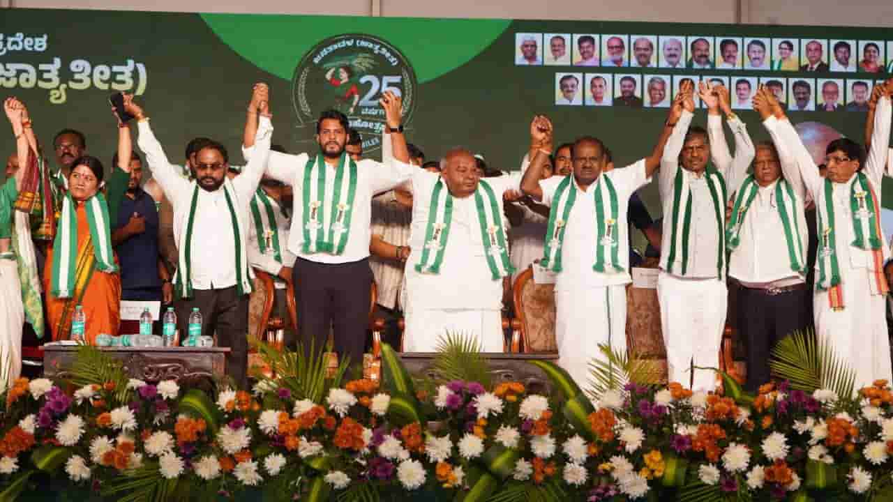 ಪ್ರಾದೇಶಿಕ ಪಕ್ಷ ಜೆಡಿಎಸ್ ಅಸ್ಥಿತ್ವಕ್ಕೆ ಬಂದು 25 ವರ್ಷವಾಗಿದೆ. ಈ ಹಿನ್ನೆಲೆಯಲ್ಲಿ ಇಂದು ಬೆಂಗಳೂರಿನ ಕೊಮ್ಮಗಟದಲ್ಲಿ ಬೃಹತ್ ಸಮಾವೇಶ ಮಾಡಲಾಗಿದ್ದು, ಆ ಮೂಲಕ ದಳಪತಿಗಳು ಭರ್ಜರಿ ಶಕ್ತಿ ಪ್ರದರ್ಶನ ಮಾಡಿದ್ದಾರೆ. ಮಾಜಿ ಪ್ರಧಾನಿ ಹೆಚ್ಡಿ ದೇವೇಗೌಡ, ಕೇಂದ್ರ ಸಚಿವ ಹೆಚ್ಡಿ ಕುಮಾರಸ್ವಾಮಿ ನೇತೃತ್ವದಲ್ಲಿ ಸಾವಿರಾರು ಸಂಖ್ಯೆಯಲ್ಲಿ ಕಾರ್ಯಕರ್ತರನ್ನ ಸೇರಿಸಿ ಜಿಬಿಎ ಚುನಾವಣೆಗೆ ದಳಪತಿಗಳು ರಾಷ್ಟ್ರೀಯ ಪಕ್ಷಗಳಿಗಿಂತ ಮುಂಚಿತವಾಗಿ ರಣ ಕಹಳೆ ಊದಿದ್ದಾರೆ. ಮಾಜಿ ಪ್ರಧಾನಿ ದೇವೇಗೌಡರು ಸಮಾವೇಶ ಉದ್ಘಾಟಿಸಿದರೆ, ಇಡೀ ದಳಪತಿಗಳ ಸೈನ್ಯವೇ ಕಾಂಗ್ರೆಸ್ ಸರ್ಕಾರದ ವಿರುದ್ಧ ಯುದ್ಧ ಸಾರಿದೆ.