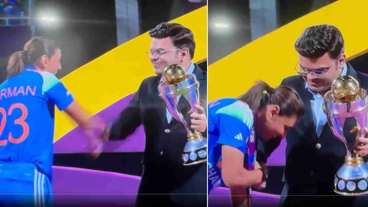 ಐಸಿಸಿ ಅಧ್ಯಕ್ಷ ಜಯ್ ಶಾ ಟ್ರೋಫಿ ಹಿಡಿದು ವೇದಿಕೆಯ ಮೇಲೆ ನಿಂತಿದ್ದರು. ಹರ್ಮನ್ಪ್ರೀತ್ ಕೌರ್ ಬಂದು ಅವರ ಕೈಕುಲುಕಿದರು. ನಂತರ ಹರ್ಮನ್ ಅವರು ಜಯ್ ಶಾ ಅವರ ಪಾದಗಳನ್ನು ಮುಟ್ಟಲು ಪ್ರಯತ್ನಿಸಿದರು, ಆದರೆ ಜಯ್ ಶಾ ಅವರು ಹಾಗೆ ಮಾಡದಂತೆ ತಡೆದರು. ನಂತರ ಅವರು ಆಕೆಯ ಮುಂದೆ ನಮಸ್ಕರಿಸಿ ಗೌರವ ವ್ಯಕ್ತಪಡಿಸಿದರು. ಜಯ್ ಶಾ ಹರ್ಮನ್ಪ್ರೀತ್ ಕೌರ್ ಅವರಿಗೆ ಗೌರವ ತೋರಿಸಿದ್ದಲ್ಲದೆ, ನಮ್ಮ ದೇಶದ ಹೆಣ್ಣುಮಕ್ಕಳು ಯಾವುದರಲ್ಲೂ ಕಡಿಮೆಯಿಲ್ಲ ಎಂದು ತೋರಿಸಿದರು.