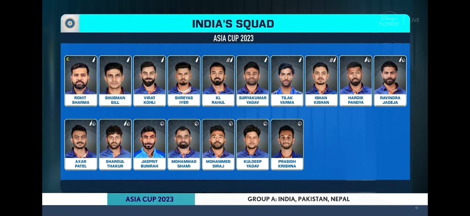 Rohit Sharma (Captain), Shubman Gill, Virat Kohli, Shreyas Iyer, Suryakumar Yadav, Tilak Varma, KL Rahul, Ishan Kishan, Hardik Pandya (VC), Ravindra Jadeja, Shardul Thakur, Axar Patel, Kuldeep Yadav, Jasprit Bumrah, Mohd. Shami, Mohd. Siraj, Prasidh Krishna