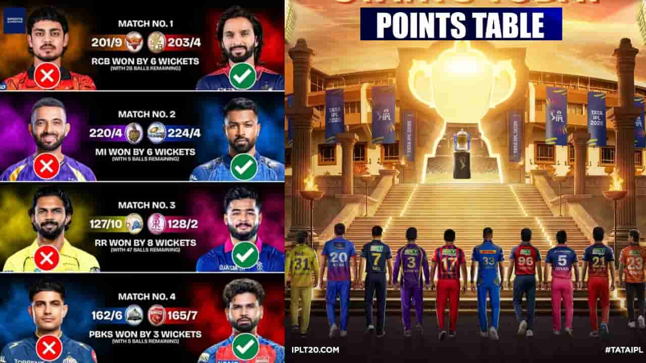 ಮಾರ್ಚ್ 28 ರಿಂದ ಆರಂಭವಾದ ಐಪಿಎಲ್ 2026 ರಲ್ಲಿ (IPL 2026) ಇದುವರೆಗೆ ನಾಲ್ಕು ಪಂದ್ಯಗಳು ನಡೆದಿವೆ. ಅಂದರೆ 10 ತಂಡಗಳ ಪೈಕಿ 8 ತಂಡಗಳು ತಲಾ ಒಂದೊಂದು ಪಂದ್ಯವನ್ನು ಆಡಿವೆ. ಇಂದು ನಡೆಯುವ ಲಕ್ನೋ ಸೂಪರ್ಜೈಂಟ್ಸ್ ಹಾಗೂ ಡೆಲ್ಲಿ ನಡುವಿನ ಪಂದ್ಯದ ಬಳಿಕ ಎಲ್ಲಾ ತಂಡಗಳು ಒಂದೊಂದು ಪಂದ್ಯವನ್ನು ಆಡಿದಂತಾಗುತ್ತದೆ. ಈಗ ಆಡಿರುವ 8 ತಂಡಗಳ ಪೈಕಿ, 4 ತಂಡಗಳು ಗೆಲುವಿನ ಖಾತೆ ತೆರೆದಿದ್ದರೆ, ಇನ್ನ 4 ತಂಡಗಳು ಸೋಲಿಗೆ ಶರಣಾಗಿವೆ. ಹೀಗಾಗಿ ಗೆದ್ದ 4 ತಂಡಗಳಿಗೆ 2 ಅಂಕಗಳು ಸಿಕ್ಕಿದ್ದರೆ, ಸೋತ ತಂಡಗಳು ಅಂಕಗಳ ಖಾತೆ ತೆರೆದಿಲ್ಲ. ಆದಾಗ್ಯೂ ಗೆದ್ದಿರುವ 4 ತಂಡಗಳ ಪೈಕಿ ಯಾವ ತಂಡ ಪಾಯಿಂಟ್ ಪಟ್ಟಿಯಲ್ಲಿ ಅಗ್ರಸ್ಥಾನದಲ್ಲಿದೆ? ಸೋತ ತಂಡಗಳ ಪೈಕಿ ಯಾವ ತಂಡ ಕೊನೆಯ ಸ್ಥಾನದಲ್ಲಿದೆ ಎಂಬುದನ್ನು ನೋಡುವುದಾದರೆ..