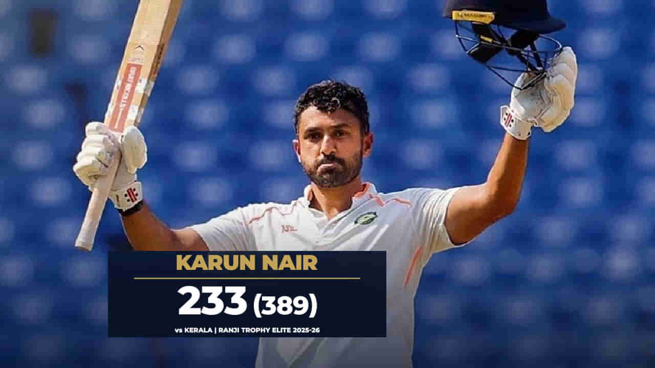 ಇನ್ನು ಕೇರಳ ವಿರುದ್ಧದ ಪಂದ್ಯದಲ್ಲಿ ಕರುಣ್ 389 ಎಸೆತಗಳನ್ನು ಎದುರಿಸಿ 25 ಬೌಂಡರಿ ಹಾಗೂ 2 ಸಿಕ್ಸರ್ ಸಹಿತ 233 ರನ್ ಬಾರಿಸಿದರು. ಇದರ ಜೊತೆಗೆ ಸ್ಮರಣ್ ರವಿಚಂದ್ರನ್ ಅವರೊಂದಿಗೆ ದಾಖಲೆಯ 338 ರನ್ಗಳ ಜೊತೆಯಾಟವನ್ನು ಹಂಚಿಕೊಂಡರು. ಈ ಪಂದ್ಯದಲ್ಲಿ ಕರುಣ್ ಅವರೊಂದಿಗೆ ಸ್ಮರಣ್ ಕೂಡ ಶತಕ ಬಾರಿಸಿದ್ದು, ಇದೀಗ ದ್ವಿಶತಕದ ಹೊಸ್ತಿಲಿನಲಿದ್ದಾರೆ.