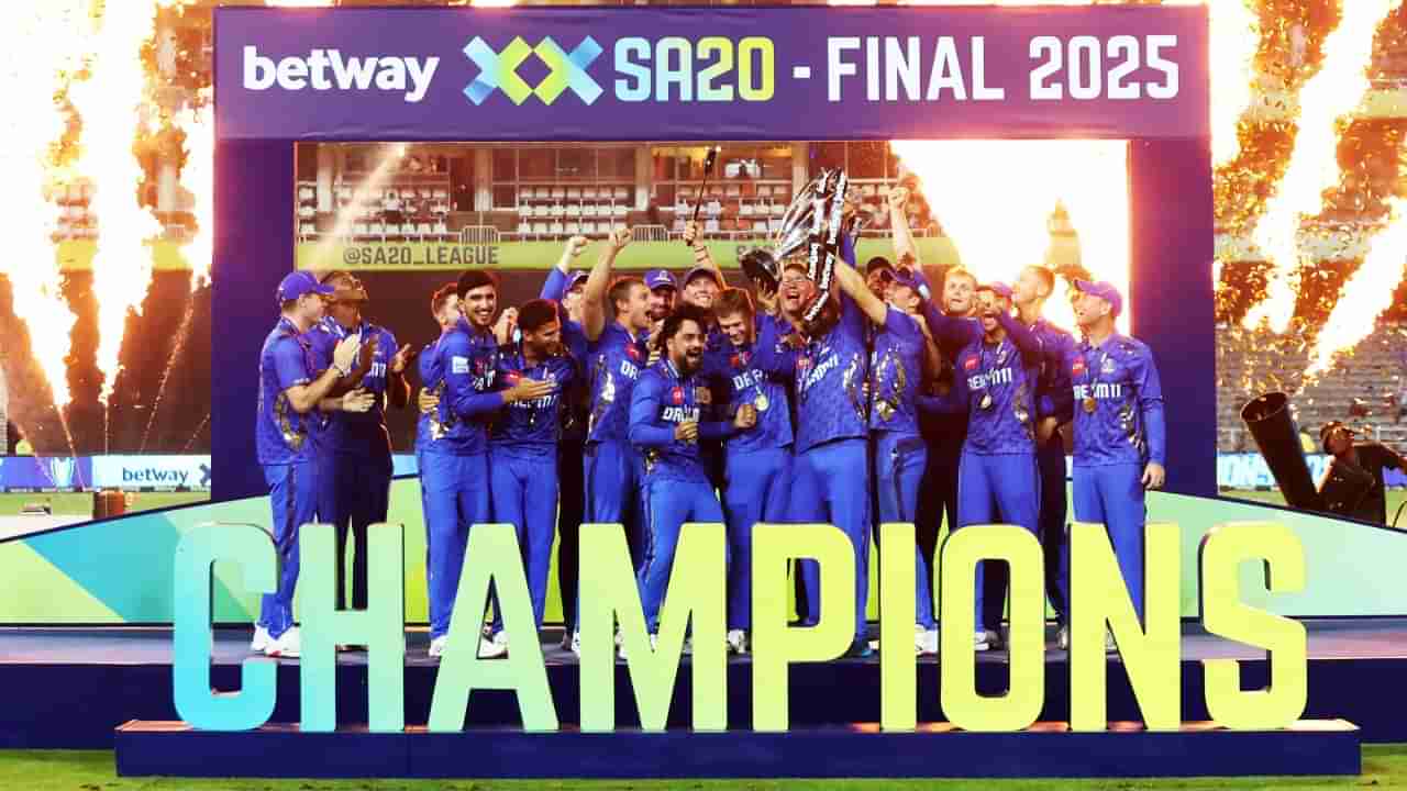 ಸೌತ್ ಆಫ್ರಿಕಾ ಟಿ20 ಲೀಗ್ನಲ್ಲಿ MI ಕೇಪ್ಟೌನ್ ತಂಡವು ಚಾಂಪಿಯನ ಪಟ್ಟ ಅಲಂಕರಿಸಿದೆ. ಜೋಹಾನ್ಸ್ಬರ್ಗ್ನ ವಾಂಡರರ್ಸ್ ಸ್ಟೇಡಿಯಂನಲ್ಲಿ ನಡೆದ ಫೈನಲ್ ಪಂದ್ಯದಲ್ಲಿ ಸನ್ರೈಸರ್ಸ್ ಈಸ್ಟರ್ನ್ ಕೇಪ್ ತಂಡವನ್ನು 76 ರನ್ಗಳಿಂದ ಮಣಿಸಿ ಎಂಐ ಕೇಪ್ಟೌನ್ ಚೊಚ್ಚಲ ಬಾರಿ ಟ್ರೋಫಿಯನ್ನು ಎತ್ತಿ ಹಿಡಿದಿದೆ. ಇದಕ್ಕೂ ಮುನ್ನ ಈ ಪಂದ್ಯದಲ್ಲಿ ಟಾಸ್ ಗೆದ್ದ MI ಕೇಪ್ಟೌನ್ ತಂಡದ ನಾಯಕ ರಶೀದ್ ಖಾನ್ ಬ್ಯಾಟಿಂಗ್ ಆಯ್ದುಕೊಂಡಿದ್ದರು.