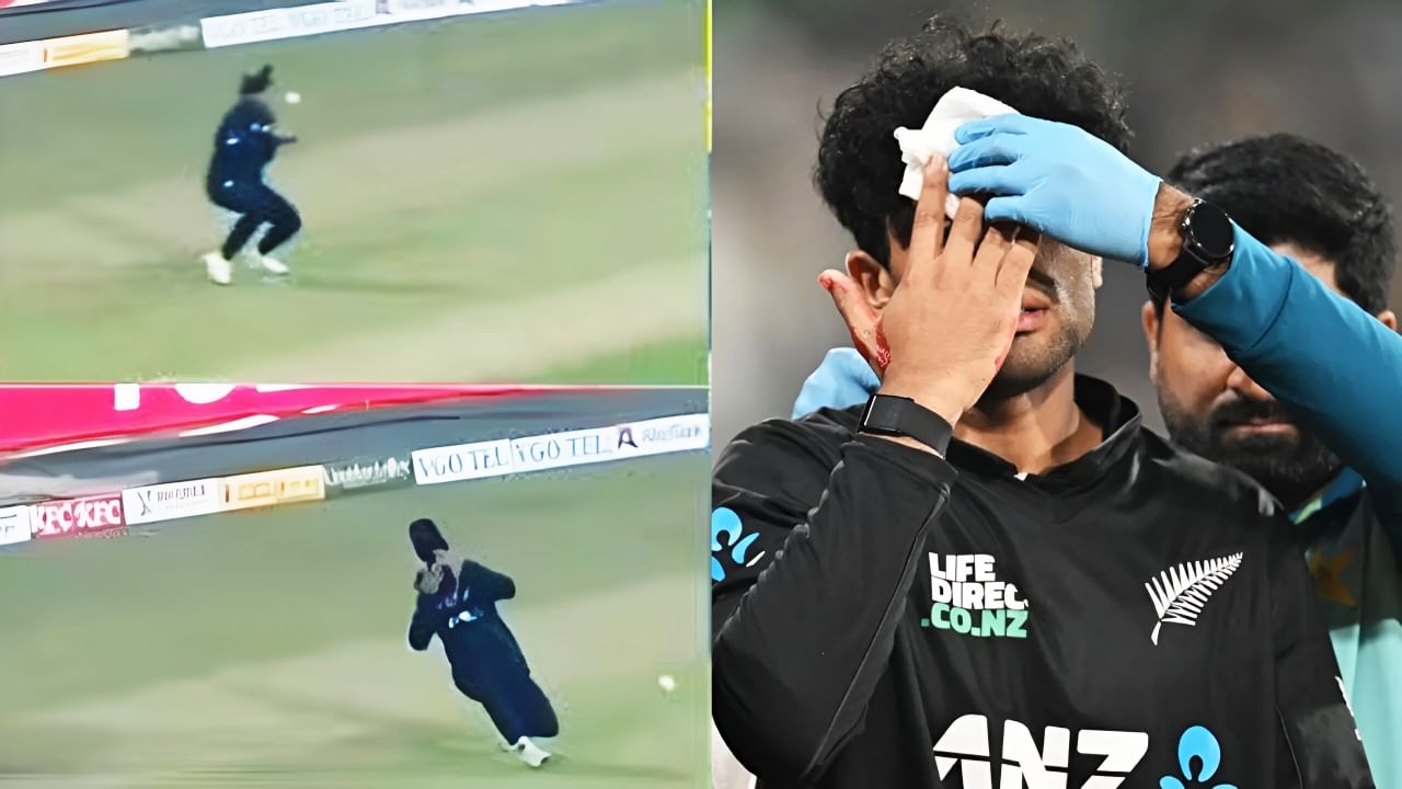 ಅತ್ತ ಬೌಂಡರಿ ಲೈನ್ನಲ್ಲಿದ್ದ ರಚಿನ್ ರವೀಂದ್ರ ಕ್ಯಾಚ್ ಹಿಡಿಯಲು ಓಡಿ ಬಂದಿದ್ದಾರೆ. ಆದರೆ ಫ್ಲಡ್ಲೈಟ್ ಬೆಳಕಿನಿಂದಾಗಿ ಚೆಂಡನ್ನು ಸರಿಯಾಗಿ ಗುರುತಿಸುವಲ್ಲಿ ರಚಿನ್ ಎಡವಿದ್ದಾರೆ. ಪರಿಣಾಮ ಬಾಲ್ ನೇರವಾಗಿ ಮುಖಕ್ಕೆ ಬಡಿದಿದೆ.