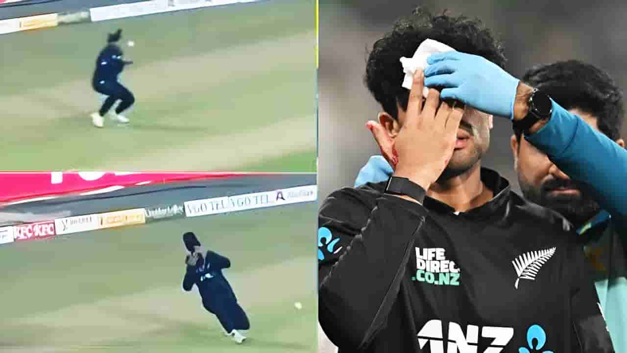 ಅತ್ತ ಬೌಂಡರಿ ಲೈನ್ನಲ್ಲಿದ್ದ ರಚಿನ್ ರವೀಂದ್ರ ಕ್ಯಾಚ್ ಹಿಡಿಯಲು ಓಡಿ ಬಂದಿದ್ದಾರೆ. ಆದರೆ ಫ್ಲಡ್ಲೈಟ್ ಬೆಳಕಿನಿಂದಾಗಿ ಚೆಂಡನ್ನು ಸರಿಯಾಗಿ ಗುರುತಿಸುವಲ್ಲಿ ರಚಿನ್ ಎಡವಿದ್ದಾರೆ. ಪರಿಣಾಮ ಬಾಲ್ ನೇರವಾಗಿ ಮುಖಕ್ಕೆ ಬಡಿದಿದೆ.