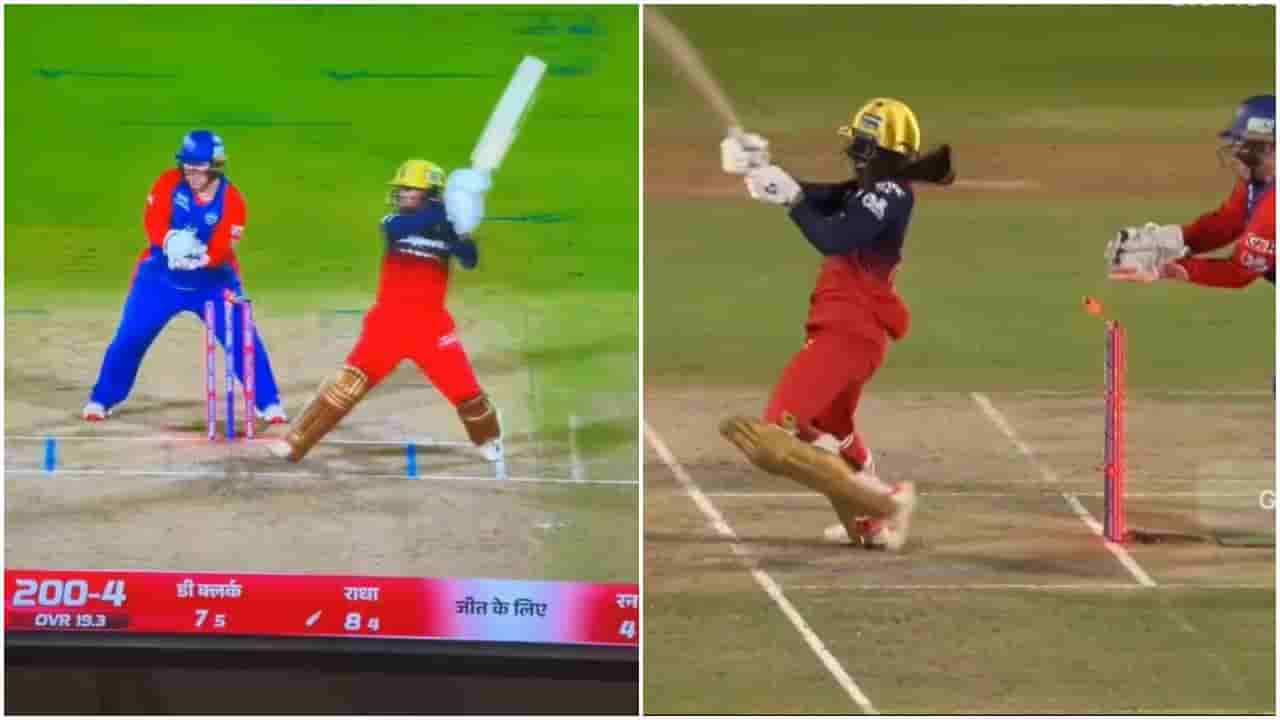 ಕೊನೆಯ ಓವರ್ನಲ್ಲಿ ಬೇಕಿದ್ದಿದ್ದು 10 ರನ್ಗಳು. ಆಗ, ಮೊದಲ ಎರಡು ಬಾಲ್, ಎರಡು ಸಿಂಗಲ್ ಬಂತು. ಕ್ರೀಜ್ನಲ್ಲಿ ಇದ್ದ ರಾಧಾ ಅವರು ಮೂರನೇ ಬಾಲ್ನ ಫೋರ್ಗಡಿಗೆ ಅಟ್ಟಿದರು. ನಾಲ್ಕನೇ ಬಾಲ್ ಕೂಡ ಫೋರ್ ಬಾರಿಸಿದರು. ಈ ವೇಳೆ ರಾಧಾ ಅವರ ಬ್ಯಾಟ್ ಸ್ಟಂಪ್ಗೆ ತಾಗಿದೆ ಎಂದು ಕೆಲವರು ಹೇಳಿದ್ದಾರೆ.