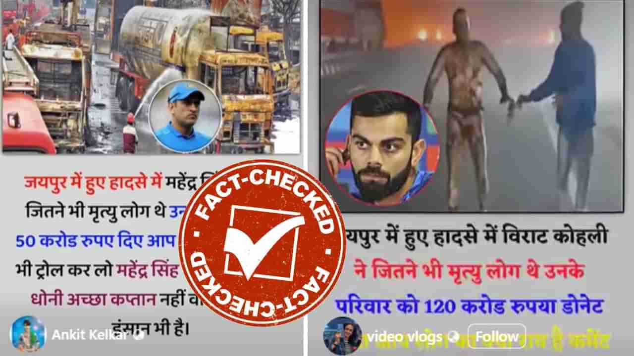 ಜೈಪುರದ ಹೆದ್ದಾರಿಯಲ್ಲಿ ಸಂಭವಿಸಿದ ಎಲ್ಪಿಜಿ ಟ್ಯಾಂಕರ್ ಅಪಘಾತದಲ್ಲಿ 19 ಜನರು ಸಾವನ್ನಪ್ಪಿದ್ದಾರೆ ಮತ್ತು ಹಲವರು ಗಾಯಗೊಂಡಿದ್ದಾರೆ. ಇದೀಗ ಈ ಅಪಘಾತಕ್ಕೆ ಸಂಬಂಧಿಸಿದ ಮೂರು ಪೋಸ್ಟ್ ಗಳು ಸಾಮಾಜಿಕ ಜಾಲತಾಣಗಳಲ್ಲಿ ವೈರಲ್ ಆಗುತ್ತಿವೆ. ಜೈಪುರ ಅಪಘಾತದ ಸಂತ್ರಸ್ತರಿಗೆ ಮಹೇಂದ್ರ ಸಿಂಗ್ ಧೋನಿ, ವಿರಾಟ್ ಕೊಹ್ಲಿ ಮತ್ತು ಹಾರ್ದಿಕ್ ಪಾಂಡ್ಯ ಆರ್ಥಿಕವಾಗಿ ಸಹಾಯ ಮಾಡಿದ್ದಾರೆ ಎಂದು ಹೇಳಲಾಗುತ್ತಿದೆ. ಅಪಘಾತದಲ್ಲಿ ಗಾಯಗೊಂಡವರಿಗೆ ಧೋನಿ 50 ಕೋಟಿ ನೀಡಿದ್ದರೆ, ಕೊಹ್ಲಿ 120 ಕೋಟಿ ನೀಡಿದ್ದಾರೆ ಎಂದು ಕೆಲವು ಬಳಕೆದಾರರು ಹೇಳಿಕೊಳ್ಳುತ್ತಿದ್ದಾರೆ.
