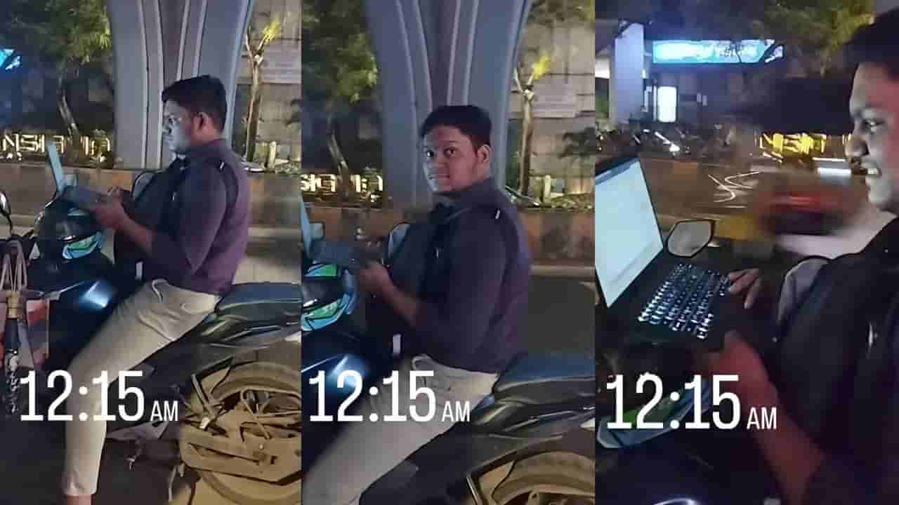 @ravi_bhojane ಹೆಸರಿನ ಇನ್ಸ್ಟಾಗ್ರಾಮ್ ಖಾತೆಯಲ್ಲಿ ಹಂಚಿಕೊಳ್ಳಲಾಗಿದೆ. ನಗರದ ಹೆಚ್ಚಿನ ಜನರು ನಿದ್ರಿಸುತ್ತಿರುವ ಸಮಯದಲ್ಲಿ ಅಂದರೆ ತಡರಾತ್ರಿ 12:15 ಕ್ಕೆ ವ್ಯಕ್ತಿಯೊಬ್ಬ ಬೈಕ್ನಲ್ಲಿ ಲ್ಯಾಪ್ ಟಾಪ್ ತೆರೆದು ಕುಳಿತು ಕೆಲಸ ಮಾಡುತ್ತಿರುವುದನ್ನು ಕಾಣಬಹುದು. ಈ ದೃಶ್ಯವನ್ನು ಮೊಬೈಲ್ ಕ್ಯಾಮೆರಾದಲ್ಲಿ ವ್ಯಕ್ತಿಯೊಬ್ಬ ಸೆರೆ ಹಿಡಿದಿದ್ದು, ಕೆಲಸದಲ್ಲಿ ಬ್ಯುಸಿಯಾಗಿರುವ ವ್ಯಕ್ತಿಯನ್ನು ಮಾತನಾಡಿಸಿದ್ದಾನೆ. ಕೆಲಸ ಮಾಡುತ್ತಿರುವ ಬಗ್ಗೆ ವಿಚಾರಿಸಿದಾಗ ಲ್ಯಾಪ್ ಟಾಪ್ ಹಿಡಿದು ಕುಳಿತ ವ್ಯಕ್ತಿಯೂ ಏನು ಮಾತನಾಡದೇ ನಕ್ಕಿದ್ದಾನೆ.