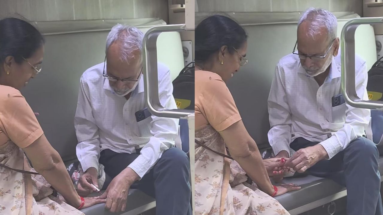 ಈ ವಿಡಿಯೋದಲ್ಲಿ ವೃದ್ಧ ದಂಪತಿಗಳಿಬ್ಬರೂ ರೈಲಿನಲ್ಲಿ ಪ್ರಯಾಣಿಸುತ್ತಿರುವುದನ್ನು ನೋಡಬಹುದು. ಸಂಗಾತಿಯೂ ತನ್ನ ಎರಡು ಕೈಯನ್ನು ಚಾಚಿದ್ದು, ಪತಿಯೂ ಬಹಳ ಎಚ್ಚರಿಕೆಯಿಂದ ನೈಲ್ ಪಾಲಿಶ್ ಹಚ್ಚುತ್ತಿರುವುದನ್ನು ಕಾಣಬಹುದು. ಈ ಪತ್ನಿಗೆ ಪತಿಯು ಮಾರ್ಗದರ್ಶನ ಮಾಡುತ್ತಿರುವುದನ್ನು ನೋಡಬಹುದು.