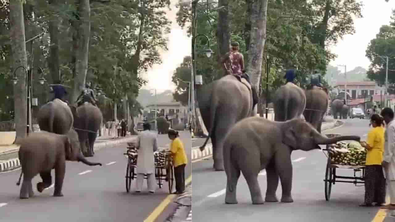ಆನೆಗಳು (elephants) ಸಾಧು ಪ್ರಾಣಿಗಳು, ಸುಖಾಸುಮ್ಮನೆ ಯಾರ ತಂಟೆಗೂ ಹೋಗುವುದಿಲ್ಲ. ಅದರಲ್ಲೂ ಈ ಮರಿ ಆನೆಗಳು ಮಾಡುವ ತುಂಟಾಟವನ್ನು ಕಣ್ತುಂಬಿಸಿಕೊಳ್ಳುವ ಖುಷಿಯೇ ಬೇರೆ. ಅವುಗಳ ಆಟ, ತುಂಟಾಟಗಳನ್ನು ನೋಡಿದ್ರೆ ಒಮ್ಮೆ ಮುದ್ದಾಡಬೇಕೆನಿಸುತ್ತದೆ. ಆನೆಗಳಿಗೆ ಸಂಬಂಧಪಟ್ಟ ವಿಡಿಯೋಗಳು ಸೋಶಿಯಲ್ ಮೀಡಿಯಾದಲ್ಲಿ (social media) ಆಗಾಗ ವೈರಲ್ ಆಗುತ್ತಿರುತ್ತದೆ. ಇಲ್ಲೊಂದು ಮರಿಯಾನೆ ಮಾಡಿದ ಕೆಲಸ ನೋಡಿದ್ರೆ ಎಷ್ಟು ಕಿಲಾಡಿ ಈ ಆನೆ ಎಂದೆನಿಸದೇ ಇರದು. ರಸ್ತೆಯಲ್ಲಿ ತನ್ನ ಪರಿವಾರದೊಂದಿಗೆ ನಡೆದುಕೊಂಡು ಹೋಗುತ್ತಿದ್ದ ವೇಳೆ ಹೊಟ್ಟೆ ಹಸಿವು ತಾಳಲಾರದೇ ಮರಿ ಆನೆಯೊಂದು ತಳ್ಳುಗಾಡಿಯಲ್ಲಿದ್ದ ಹಣ್ಣನ್ನು ಕದ್ದು ತಿಂದಿದೆ. ಸಾಮಾಜಿಕ ಜಾಲತಾಣಗಳಲ್ಲಿ ಹರಿದಾಡುತ್ತಿರುವ ಈ ಮುದ್ದಾದ ವಿಡಿಯೋ ಕಂಡ ಬಳಕೆದಾರರು ಈ ಕಿಲಾಡಿ ಮರಿಯಾನೆ ಕೆಲಸ ಕಂಡು ಶಾಕ್ ಆಗಿದ್ದಾರೆ.