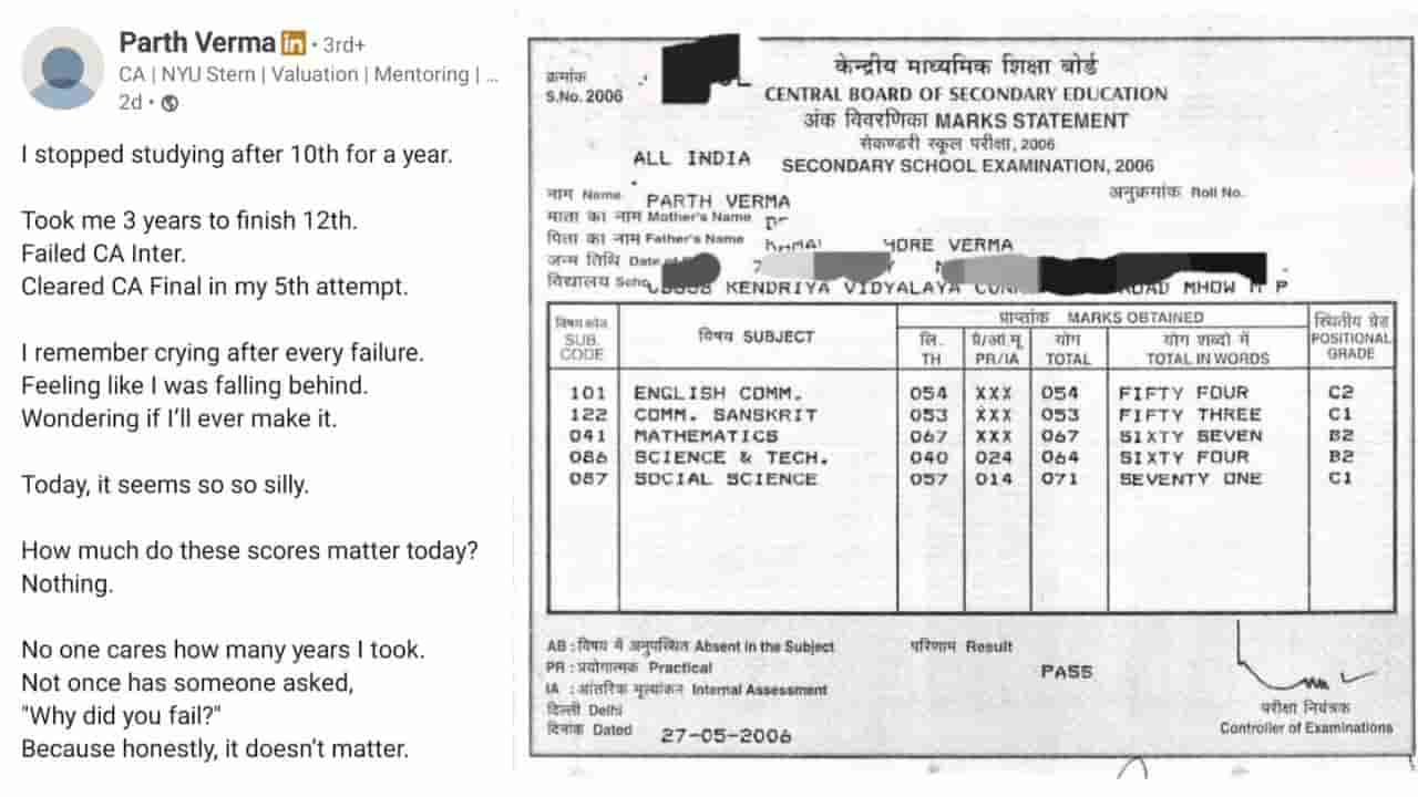 Partha Verma ಹೆಸರಿನ ಲಿಂಕ್ಡ್ ಇನ್ ಖಾತೆಯಲ್ಲಿ ತಮ್ಮ ಸಿಬಿಎಸ್ಇ ಹತ್ತನೇಯ ತರಗತಿ ಅಂಕ ಪಟ್ಟಿಯನ್ನು ಹಂಚಿಕೊಂಡಿದ್ದಾರೆ. ಈ ಫೋಟೋದೊಂದಿಗೆ ಪಿಯುಸಿ ಪೂರ್ಣ ಗೊಳಿಸಲು ಮೂರು ವರ್ಷ ಬೇಕಾಯಿತು. ಅದಲ್ಲದೇ ಸಿಎ ಆಗುವ ಹಾದಿ ಕಠಿಣವಾಗಿತ್ತು. ಸಿಎ ಫೈನಲ್ ನಲ್ಲಿ ಹಲವು ಬಾರಿ ವಿಫಲನಾದೆ. ಐದನೇಯ ಪ್ರಯತ್ನದಲ್ಲಿ ಸಿಎ ಪರೀಕ್ಷೆಯಲ್ಲಿ ಉತ್ತೀರ್ಣನಾದೆ. ಪ್ರತಿ ಬಾರಿ ಸೋತಾಗಲು ಅಳುತ್ತಿದ್ದೆ. ತನ್ನಿಂದ ಇದು ಸಾಧ್ಯನಾ ಎಂದು ತನ್ನ ಬಗ್ಗೆಯೇ ಸಂದೇಹ ಪಟ್ಟುಕೊಳ್ಳುತ್ತಿದ್ದೆ. ಆದರೆ ಅದನ್ನು ಈಗ ಎನಿಸಿಕೊಳ್ಳುವಾಗ ಮೂರ್ಖತನ ಎಂದೆನಿಸುತ್ತದೆ.