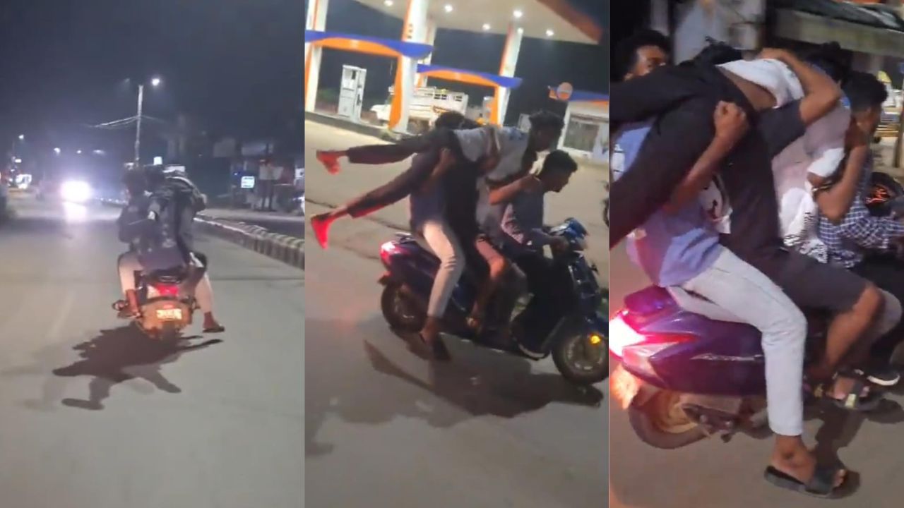 ಇಲ್ಯಾಸ್ (Ilyas) ಹೆಸರಿನ ಎಕ್ಸ್ ಖಾತೆಯಲ್ಲಿ ಶೇರ್ ಮಾಡಲಾದ ವಿಡಿಯೋದಲ್ಲಿ ಐವರು ಯುವಕರು ಒಂದೇ ಸ್ಕೂಟರ್ ನಲ್ಲಿ ಪ್ರಯಾಣಿಸುತ್ತಿರುವುದನ್ನು ಕಾಣಬಹುದು. ಇಲ್ಲಿ ನಾಲ್ವರು ಯುವಕರು ಒಂದೇ ಸ್ಕೂಟರ್ನಲ್ಲಿ ಕುಳಿತುಕೊಂಡಿದ್ದು, ಇನ್ನೊಬ್ಬ ಅವರ ಹೆಗಲ ಮೇಲೆ ಮಲಗಿ ನೇತಾಡುತ್ತಿರುವುದನ್ನು ಕಾಣಬಹುದು. ಈ ಐವರು ಯುವಕರು ಅಪಾಯಕಾರಿ ಸ್ಟಂಟ್ ಮಾಡುತ್ತಿರುವುದನ್ನು ಪಾದಚಾರಿಯೊಬ್ಬರು ಚಿತ್ರೀಕರಿಸಿದ್ದು, ಸ್ಟಂಟ್ ಚೆನ್ನಾಗಿದೆ, ಒಳ್ಳೆಯದಾಗಲಿ ಎಂದಿದ್ದಾರೆ. ಈ ವೇಳೆ ಯುವಕರು ಧನ್ಯವಾದ ಹೇಳುವುದನ್ನು ಕಾಣಬಹುದು.