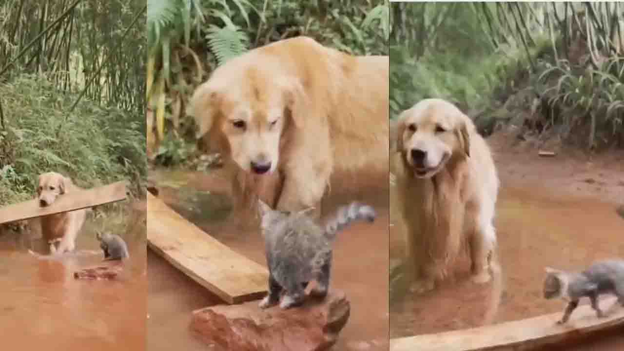 ಎಷ್ಟೊತ್ತಿನಿಂದ ಈ ಮರಿಬೆಕ್ಕು ಹೀಗೆ ನಟ್ಟನಡುವೆ ನಿಂತುಕೊಂಡಿತ್ತೋ, ನಿಂತು ಹೆದರಿತ್ತೋ ಗೊತ್ತಿಲ್ಲ. ಅಂತೂ ಈ ನಾಯಿ ಮರದ ತುಂಡನ್ನು ಎಲ್ಲಿಂದಲೋ ಹುಡುಕಿಕೊಂಡು ಬಂದಿದೆ. ಸರಾಗವಾಗಿ ಬೆಕ್ಕು ದಾಟಿದೆ. ಹೀಗೆಂದುಕೊಳ್ಳುತ್ತ ಸಿನೆಮಾದ ದೃಶ್ಯದಂತೆ ನೀವೆಲ್ಲ ನೋಡಿ ಮರುಗಿದ್ದೀರಿ, ಮನಸ್ಸನ್ನು ಆರ್ದ್ರಗೊಳಿಸಿಕೊಂಡಿದ್ದೀರಿ.