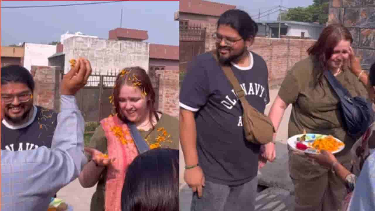 ಭಾರತದ ಯುವಕರು ಹೆಚ್ಚಾಗಿ ವಿದೇಶಿ ಮಹಿಳೆಯರನ್ನು ವರಿಸುತ್ತಿದ್ದಾರೆ. ವಿದೇಶಿ ಮಹಿಳೆಯರು ಕೂಡ ಭಾರತ ಪುರುಷರೇ ಹೆಚ್ಚು ಇಷ್ಟ ಪಡುತ್ತಾರೆ. ಇದರ ಜತೆಗೆ ಭಾರತದ ಸಂಪ್ರದಾಯಗಳು ಕೂಡ ಈ ವಿದೇಶಿ ಮಹಿಳೆಯರಿಗೆ ಇಷ್ಟ. ಇದೀಗ ಇಲ್ಲೊಂದು ಹೃದಯಸ್ಪರ್ಶಿ ವಿಡಿಯೋ ವೈರಲ್ ಆಗಿದೆ. ಜಮ್ಮುವಿನಲ್ಲಿರುವ ತನ್ನ ಮನೆಗೆ ವಿದೇಶಿ ಸ್ನೇಹಿತೆಯನ್ನು ಕೆರದುಕೊಂಡು ಬಂದ ಭಾರತದ ಯುವಕನಿಗೆ ಮನೆಯವರು (Indian Parents) ಅದ್ಧೂರಿಯಾಗಿ ಸ್ವಾಗತಿಸಿದ್ದಾರೆ. ಇದೀಗ ಈ ವಿಡಿಯೋ ಸಾಮಾಜಿಕ ಜಾಲತಾಣದಲ್ಲಿ ವೈರಲ್ ಆಗಿದೆ. ಮಗ ಹೆಂಡತಿಯನ್ನು ತುಂಬಾ ಖುಷಿಯಿಂದ ಸ್ವಾಗತ ಮಾಡಿದ್ದಾರೆ. ಜಮ್ಮುವಿನ ಅತುಲ್ ಮತ್ತು ಅವರ ಅಮೇರಿಕನ್ ಗೆಳತಿ ಕ್ಲೇರ್ (American Girlfriend) ತಮ್ಮ ಇನ್ಸ್ಟಾಗ್ರಾಮ್ ಖಾತೆಯಲ್ಲಿ ಈ ವಿಡಿಯೋವನ್ನು ಹಂಚಿಕೊಂಡಿದ್ದಾರೆ.