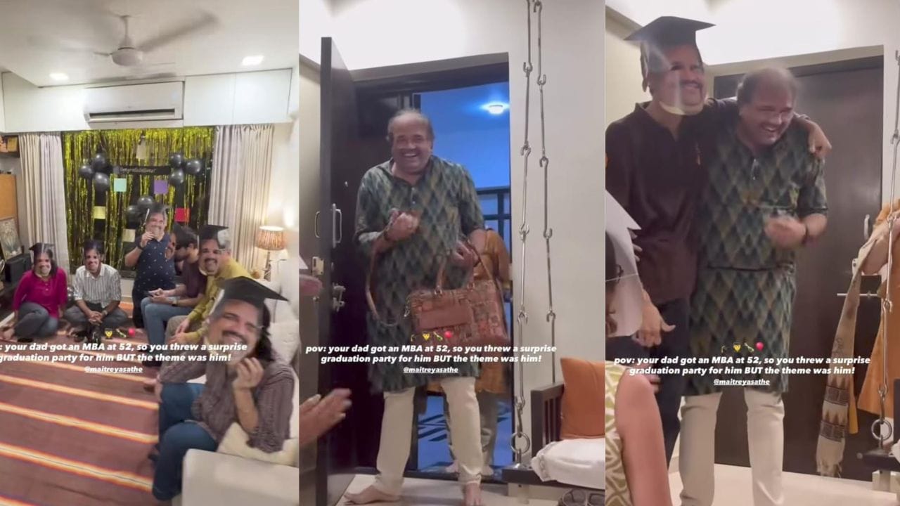 mitreyasathe ಹೆಸರಿನ ಇನ್ಸ್ಟಾಗ್ರಾಮ್ ಖಾತೆಯಲ್ಲಿ ಶೇರ್ ಮಾಡಲಾದ ವಿಡಿಯೋಗೆ ಪದವಿ ಪಡೆದಿದ್ದೇನೆ’ ಎಂಬ ಶೀರ್ಷಿಕೆಯನ್ನು ನೀಡಲಾಗಿದೆ. ಈ ವಿಡಿಯೋದಲ್ಲಿ ಇಳಿವಯಸ್ಸಿನಲ್ಲಿ ಎಂಬಿಎ ಪದವಿ ಪಡೆದ ವ್ಯಕ್ತಿ ತನ್ನ ಮನೆಗೆ ಪ್ರವೇಶಿಸುತ್ತಾರೆ. ಈ ವೇಳೆ ಅವರ ಮುಖವನ್ನು ಹೋಲುವ ಮುಖವಾಡಗಳನ್ನು ಧರಿಸಿದ ಸಂಬಂಧಿಕರು ಅವರನ್ನು ಅದ್ದೂರಿಯಾಗಿ ಸ್ವಾಗತಿಸುವುದನ್ನು ಕಾಣಬಹುದು. ಮನೆಯ ಗೋಡೆಗಳನ್ನು ಕಲರ್ ಫುಲ್ ಆಗಿ ಅಲಂಕರಿಸಲಾಗಿದ್ದು, ಕುಟುಂಬ ಮತ್ತು ಸ್ನೇಹಿತರು ಸಂಭ್ರಮಿಸುವುದನ್ನು ಕಾಣಬಹುದು. ಈ ಗ್ರಾಜುವೇಷನ್ ಪಾರ್ಟಿಯನ್ನು ಮಗನೇ ಆಯೋಜಿಸಿದ್ದು ತಂದೆಗೆ ಮರೆಯಲಾಗದ ಸರ್ಪ್ರೈಸ್ ನೀಡಿದ್ದಾನೆ.