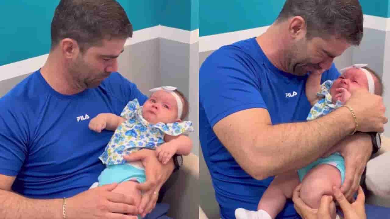 momos.usa ಹೆಸರಿನ ಖಾತೆಯಲ್ಲಿ ಹೃದಯಸ್ಪರ್ಶಿ ವಿಡಿಯೋವೊಂದು ಶೇರ್ ಮಾಡಿಕೊಳ್ಳಲಾಗಿದೆ. ಈ ವಿಡಿಯೋದಲ್ಲಿ ಪುಟ್ಟ ಕಂದಮ್ಮವೊಂದು ತನ್ನ ತಂದೆಯ ಮಡಿಲಿನಲ್ಲಿ ಮಲಗಿರುವುದನ್ನು ಕಾಣಬಹುದು. ಈ ವೇಳೆಯಲ್ಲಿ ನರ್ಸ್ ವೊಬ್ಬರು ಮಗುವಿನ ಕಾಲಿಗೆ ಲಸಿಕೆ ನೀಡುತ್ತಿದ್ದಂತೆ ನೋವಿನಿಂದ ಜೋರಾಗಿ ಮಗು ಅಳುತ್ತಿರುವುದನ್ನು ನೋಡಬಹುದು. ಇದನ್ನು ನೋಡಿದ ತಂದೆಯೂ ಜೋರಾಗಿ ಕಣ್ಣೀರು ಸುರಿಸಿದ್ದಾನೆ.