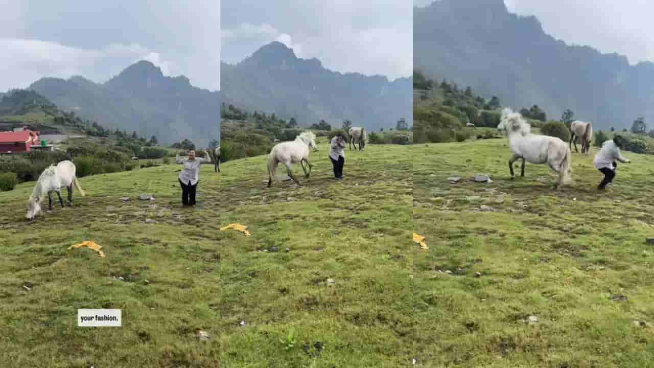ಮಕ್ಕಳಿಂದ ಹಿಡಿದು ಮುದುಕರವರೆಗೆ ರೀಲ್ಸ್, ವಿಡಿಯೋ ಮಾಡುವುದು ಟ್ರೆಂಡ್ (Reels craze) ಆಗಿ ಬಿಟ್ಟಿದೆ. ಅದರಲ್ಲೂ ಕೆಲವರಂತೂ ಸಿಕ್ಕಿದ್ದಲ್ಲೆಲ್ಲಾ ರೀಲ್ಸ್ ಮಾಡ್ತಾ ನಿಂತು ಬಿಡ್ತಾರೆ. ಹೀಗೆ ಎಲ್ಲೆಲ್ಲೋ ರೀಲ್ಸ್ ವಿಡಿಯೋಗಳನ್ನು ಮಾಡಲು ಹೋಗಿ ಫಜೀತಿಗೆ ಸಿಲುಕಿದವರ ಸ್ಟೋರಿಗಳನ್ನು ನೀವು ನೋಡಿರುತ್ತೀರಿ ಅಲ್ವಾ. ಇದೀಗ ಅಂತಹದ್ದೇ ಘಟನೆಯೊಂದು ನಡೆದಿದ್ದು, ಯುವತಿಯೊಬ್ಬಳು ಕುದುರೆಯ ಬಳಿ ನಿಂತು ರೀಲ್ಸ್ ಮಾಡಲು ಹೋಗಿ ಫಜೀತಿಗೆ ಸಿಲುಕಿದ್ದಾರೆ. ಕುದುರೆಯೊಂದು ತನ್ನ ಪಾಡಿಗೆ ಹುಲ್ಲು ಮೇಯುತ್ತಾ ನಿಂತಿದ್ದ ಸಂದರ್ಭದಲ್ಲಿ ಅಲ್ಲೇ ಯುವತಿಯೊಬ್ಬಳು ರೀಲ್ಸ್ ಮಾಡಲು ಬಂದಿದ್ದು, ಇದರಿಂದ ಕೋಪಗೊಂಡ ಕುದುರೆ (horse kicked the lady) ಆಕೆಗೆ ಜಾಡಿಸಿ ಒದ್ದಿದೆ. ಈ ದೃಶ್ಯ ಇದೀಗ ಸಿಕ್ಕಾಪಟ್ಟೆ ವೈರಲ್ ಆಗುತ್ತಿದೆ.