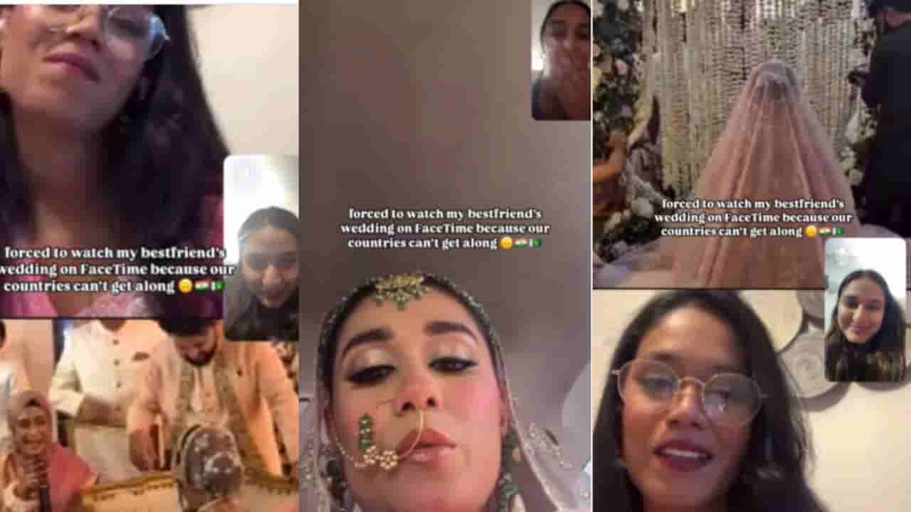 ಪಾಕಿಸ್ತಾನಕ್ಕೆ ಹೋಗಿ ಅಲ್ಲಿರುವ ಬೆಸ್ಟ್ ಫ್ರೆಂಡ್ ಮದುವೆಗೆ ಹಾಜರಾಗಲು ಸಾಧ್ಯವಾಗದ ಕಾರಣ ಭಾರತೀಯ ಯುವತಿಯೊಬ್ಬಳು ಫೇಸ್ ಟೈಮ್ ಮೂಲಕ ಮೊಬೈಲ್ ಸ್ಕ್ರೀನ್ನಲ್ಲಿಯೇ ತನ್ನ ಸ್ನೇಹಿತೆಯ ಮದುವೆಯ ಸಂಪೂರ್ಣ ದೃಶ್ಯವನ್ನು ವೀಕ್ಷಿಸಿದ್ದಾಳೆ. ಈ ಭಾವನಾತ್ಮಕ ದೃಶ್ಯ ಎಲ್ಲರನ್ನು ಭಾವುಕರನ್ನಾಗಿಸಿದೆ.