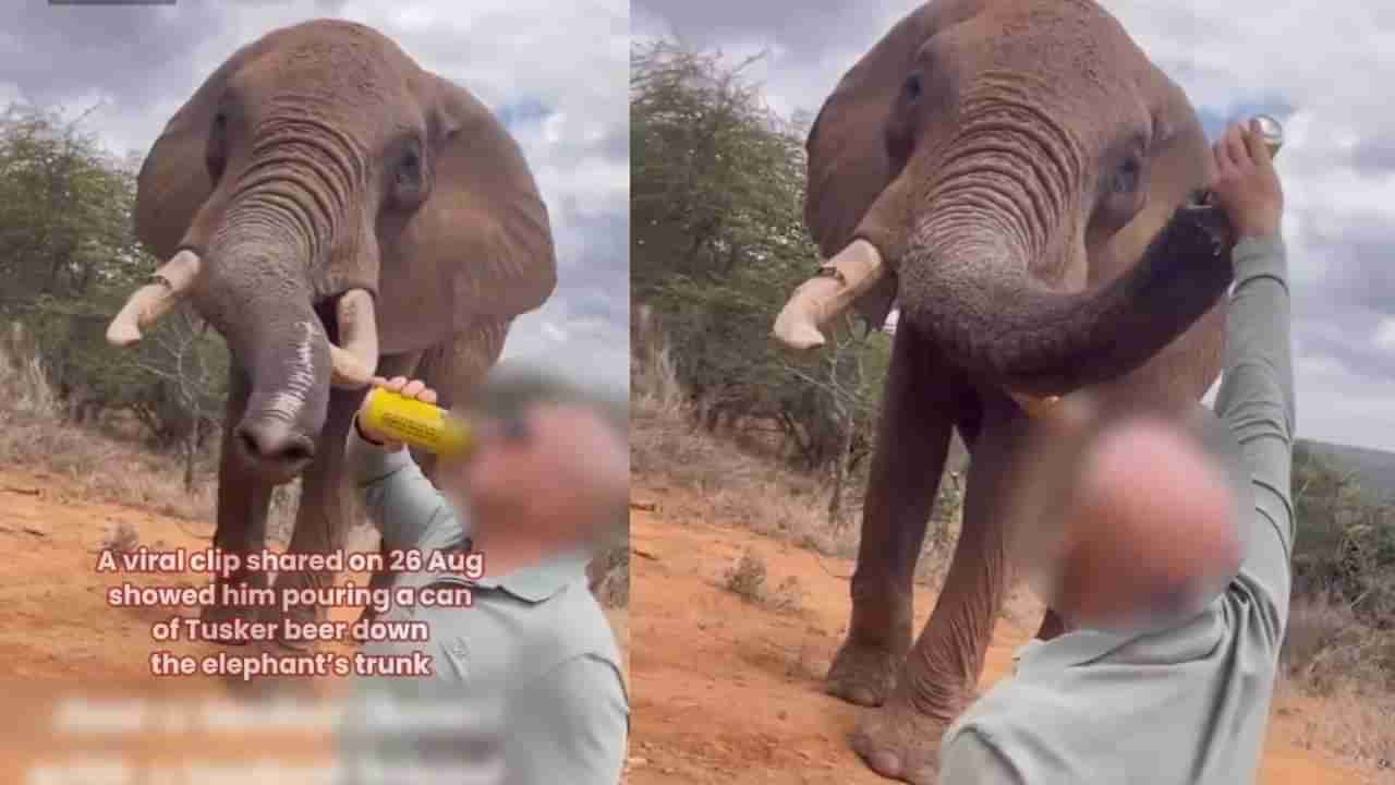 ಪ್ರಾಣಿ ಹಿಂಸೆ ಮಹಾಪಾಪ ಅನ್ನೋ ಮಾತಿದೆ. ಹೀಗಿದ್ರೂ ಕೂಡ ಅನೇಕರು ಒಂದಲ್ಲಾ ಒಂದು ರೀತಿಯಲ್ಲಿ ಪ್ರಾಣಿಗಳಿಗೆ ಹಿಂಸೆಯನ್ನು ನೀಡುತ್ತಿರುತ್ತಾರೆ. ಹೌದು ಕೆಲವರು ತಮ್ಮ ಹುಚ್ಚಾಟಗಳಿಗಾಗಿ ನಾಯಿಯ ಬಾಲಕ್ಕೆ ಪಟಾಕಿ ಕಟ್ಟಿ ಬೆಂಕಿ ಹಚ್ಚುವಂತಹ, ನಾಯಿಗೆ ಮದ್ಯ ಕುಡಿಸಿದಂತಹ ಘಟನೆಗಳು ಈ ಹಿಂದೆಯೂ ನಡೆದಿವೆ. ಇಲ್ಲೊಂದು ಇಂತಹದ್ದೇ ಘಟನೆ ನಡೆದಿದ್ದು, ವ್ಯಕ್ತಿಯೊಬ್ಬ ತಾನು ಬಿಯರ್ ಕುಡಿಯುವುದರ ಜೊತೆಗೆ ಆನೆಗೂ (Tourist pours beer to elephant’s trunk) ಬಿಯರ್ ಕುಡಿಸಿದ್ದಾನೆ. ಕೀನ್ಯಾದ ಅಭಯಾರಣ್ಯವೊಂದರಲ್ಲಿ ಸ್ಪ್ಯಾನಿಷ್ ಪ್ರವಾಸಿಗ ಆನೆಯ ಸೊಂಡಿಲಿಗೆ ಬಿಯರ್ ಸುರಿದಿದ್ದು, ಈತನ ಈ ವರ್ತನೆಗೆ ಭಾರೀ ಆಕ್ರೋಶ ವ್ಯಕ್ತವಾಗಿದೆ.