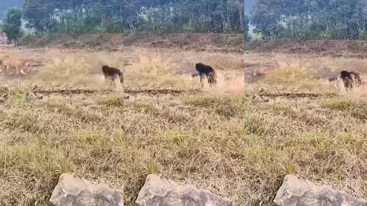 #WATCH | Hilarious! Bear Scares Away Roaring Tiger At Pench Tiger Reserve #MPvideos #MadhyaPradesh #viralvideo pic.twitter.com/FETb4JpEIs