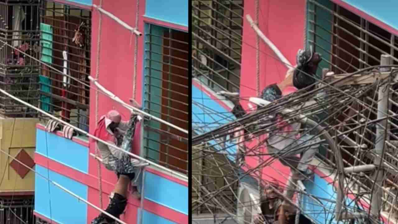 Nirob Saha ಹೆಸರಿನ ಫೇಸ್ಬುಕ್ ಖಾತೆಯಲ್ಲಿ ಶೇರ್ ಮಾಡಲಾದ ಈ ವಿಡಿಯೋದಲ್ಲಿ ಕಟ್ಟಡಕ್ಕೆ ಪೈಂಟಿಂಗ್ ಮಾಡುತ್ತಿದ್ದ ವ್ಯಕ್ತಿಯೊಬ್ಬ ಫಿಟ್ಸ್ಗೆ ತುತ್ತಾಗಿ ಏಣಿಯ ಹಗ್ಗದಲ್ಲಿ ತಲೆ ಕೆಳಗಾಗಿ ನೇತಾಡುತ್ತಿರುವ ದೃಶ್ಯವನ್ನು ಕಾಣಬಹುದು. ಆ ತಕ್ಷಣ ಅಲ್ಲಿಗೆ ಬಂದ ಆತನ ಸ್ನೇಹಿತ ಏಣಿಯೇರಿ, ಪ್ರಾಣಾಪಾಯದಲ್ಲಿ ಸಿಲುಕಿದ್ದ ಗೆಳೆಯನನ್ನು ಜೋಪಾನವಾಗಿ ಕೆಳಗಿಳಿಸಿ ಅಮೂಲ್ಯ ಜೀವವನ್ನು ಉಳಿಸಿ ಮಾನವೀಯತೆಯನ್ನು ಮೆರೆದಿದ್ದಾನೆ.