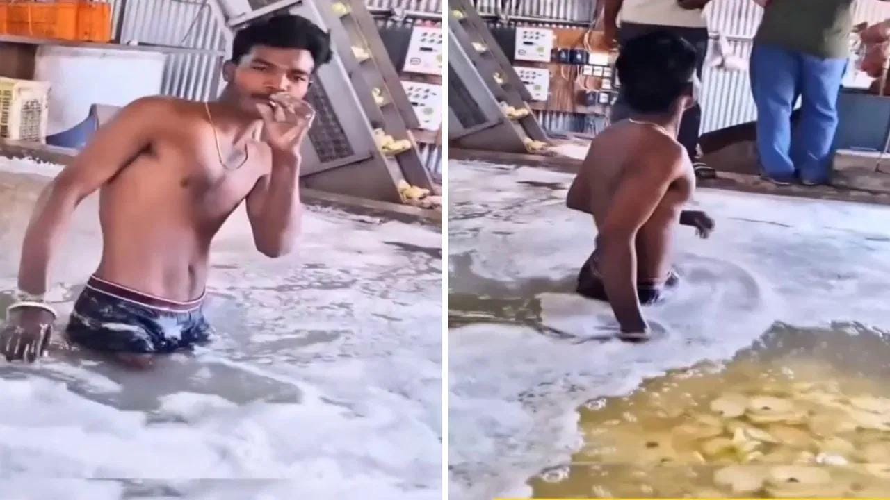 ಈ ವೈರಲ್ ವಿಡಿಯೋದಲ್ಲಿ, ಒಬ್ಬ ವ್ಯಕ್ತಿ ತನ್ನ ಒಳ ಉಡುಪುಗಳನ್ನು ಮಾತ್ರ ಧರಿಸಿ ದೊಡ್ಡ ಟ್ಯಾಂಕ್ ಒಳಗೆ ನಿಂತಿರುವುದನ್ನು ಕಾಣಬಹುದು. ಟ್ಯಾಂಕ್ ಕೊಳಕು ಸೋಪ್ ನೀರು ಮತ್ತು ಹಸಿ ಆಲೂಗಡ್ಡೆ ಚಿಪ್ಸ್ನಿಂದ ತುಂಬಿದೆ ಎಂದು ವರದಿಯಾಗಿದೆ. ಶಾಕಿಂಗ್ ಎಂದರೆ, ಆ ವ್ಯಕ್ತಿ ಟ್ಯಾಂಕ್ ಒಳಗೆ ನಿಂತು ಸಿಗರೇಟ್ ಸೇದುತ್ತಿರುವುದು ಮಾತ್ರವಲ್ಲದೆ, ಕ್ಯಾಮೆರಾವನ್ನು ನೋಡಿ ನಗುತ್ತಿದ್ದಾರೆ.