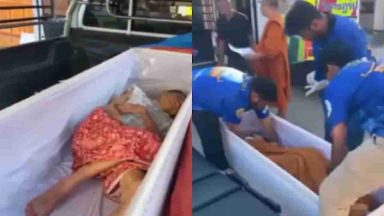 ಥೈಲ್ಯಾಂಡ್ನಲ್ಲಿ (woman wakes up coffin) ಬೆಚ್ಚಿಬೀಳುವ ಘಟನೆಯೊಂದು ನಡೆದಿದೆ. ಮಹಿಳೆಯೊಬ್ಬರು ಅಂತ್ಯಕ್ರಿಯೆಗೆ ಕೆಲವೇ ಕ್ಷಣಗಳ ಮೊದಲು ಶವಪೆಟ್ಟಿಗೆಯಲ್ಲಿ ಎಚ್ಚರಗೊಂಡಿದ್ದಾರೆ. ಇದೀಗ ಈ ಸುದ್ದಿ ಸಾಮಾಜಿಕ ಜಾಲತಾಣದಲ್ಲಿ ವೈರಲ್ ಆಗಿದೆ. ಈ ಹಿಂದೆ ಇಂತಹ ಅನೇಕ ಘಟನೆಗಳು ನಡೆದಿದೆ. ಈ ಘಟನೆ ಬ್ಯಾಂಕಾಕ್ನ ಹೊರವಲಯದಲ್ಲಿರುವ ನೊಂಥಬುರಿ ಪ್ರಾಂತ್ಯದಲ್ಲಿರುವ ಬೌದ್ಧ ದೇವಾಲಯವಾದ ವಾಟ್ ರಾಟ್ ಪ್ರಖೋಂಗ್ ಥಾಮ್ನಲ್ಲಿ ನಡೆದಿದೆ. ಪಿಕಪ್ ಟ್ರಕ್ನ ಹಿಂಭಾಗದಲ್ಲಿ ಇರಿಸಲಾದ ಬಿಳಿ ಶವಪೆಟ್ಟಿಗೆಯಲ್ಲಿ ಮಹಿಳೆ ಮಲಗಿರುವ ವೀಡಿಯೊವನ್ನು ದೇವಾಲಯವು ತನ್ನ ಅಧಿಕೃತ ಫೇಸ್ಬುಕ್ ಪುಟದಲ್ಲಿ ಹಂಚಿಕೊಂಡಿದೆ. ಈ ದೃಶ್ಯದಲ್ಲಿ ಮಹಿಳೆಯ ತೋಳುಗಳು ಮತ್ತು ತಲೆ ಸ್ವಲ್ಪ ಅಲುಗಾಡಿದೆ. ಈ ವೇಳೆ ಅಲ್ಲಿದ್ದ ಸಿಬ್ಬಂದಿಗಳು ಗಾಬರಿಗೊಂಡಿದ್ದಾರೆ.