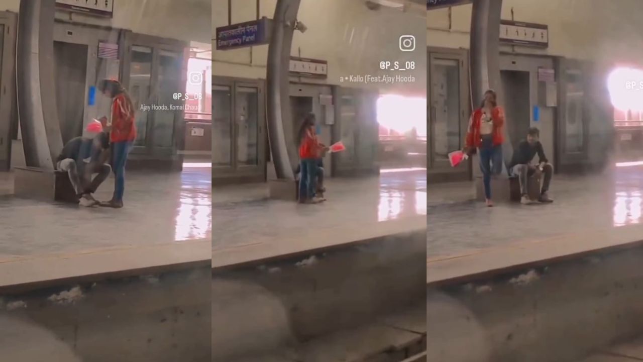 ಮೆಟ್ರೋ ನಿಲ್ದಾಣದಲ್ಲಿ ಪ್ರೇಯಸಿಯ ಕಾಲಿಗೆ ಬಿದ್ದು ನಮಸ್ಕರಿಸಿದ ಯುವಕ, ಕುಣಿದು ಕುಪ್ಪಳಿಸಿದ ಯುವತಿ