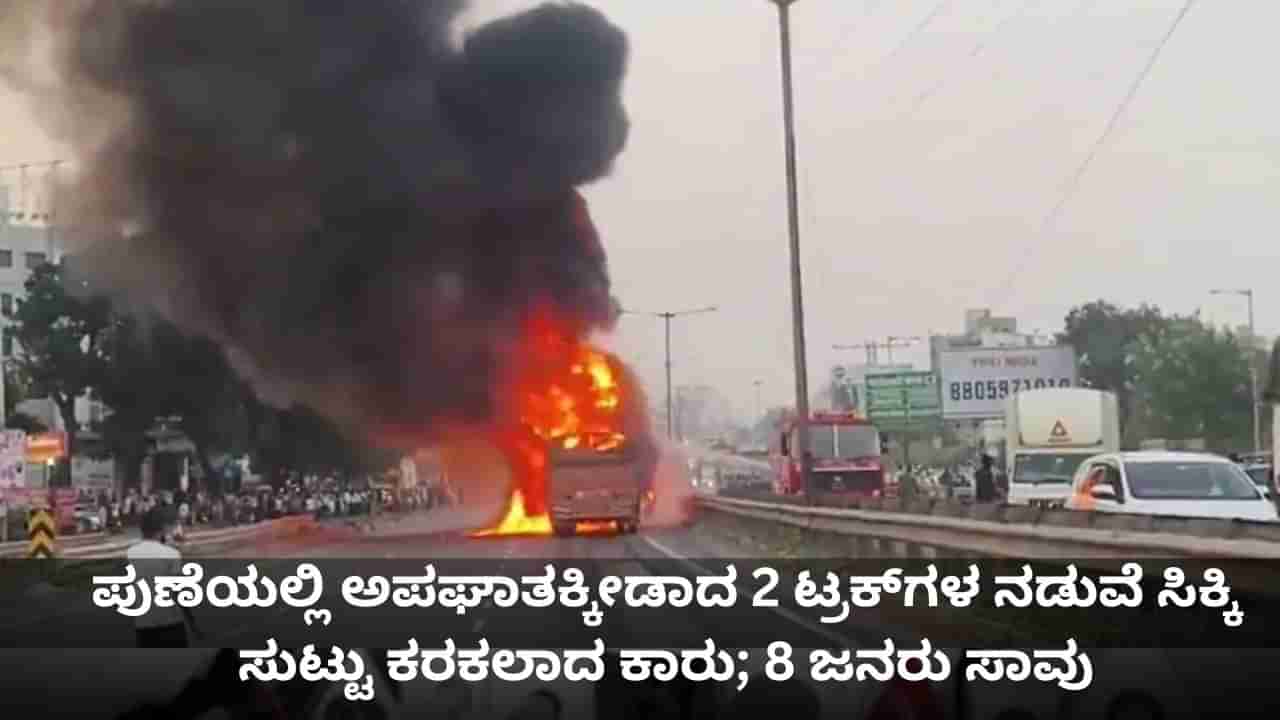 ಪುಣೆ-ಬೆಂಗಳೂರು ಹೆದ್ದಾರಿಯಲ್ಲಿ 2 ಟ್ರಕ್ಗಳ ನಡುವೆ ಸಿಕ್ಕಿ ಸುಟ್ಟು ಕರಕಲಾದ ಕಾರು; 8 ಜನ ಸಾವು