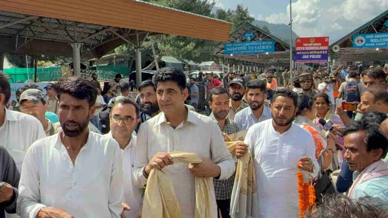 ನಾಳೆಯ ಅಮರನಾಥ ಯಾತ್ರೆಗೆ ತೆರಳಲು ಬಂದ ಭಕ್ತರಿಗೆ ಹೂವಿನ ಹಾರ ಹಾಕಿ ಸ್ವಾಗತ