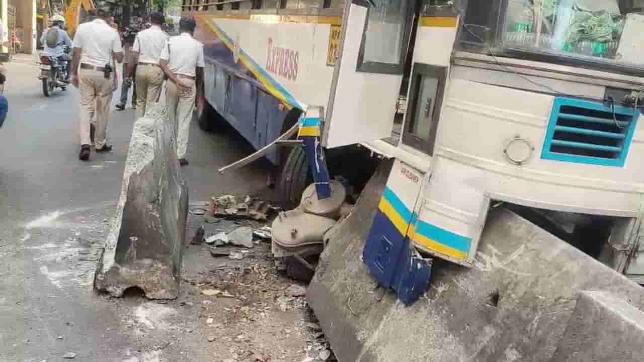 ಡಿವೈಡರ್ಗೆ ಗುದ್ದಿದ ಸಾರಿಗೆ ಬಸ್: ಅಪಘಾತದ ತೀವ್ರತೆಗೆ ಕಿತ್ತು ಬಂದ ಎಂಜಿನ್, ಮುಂಬದಿ ಚಕ್ರಗಳು!