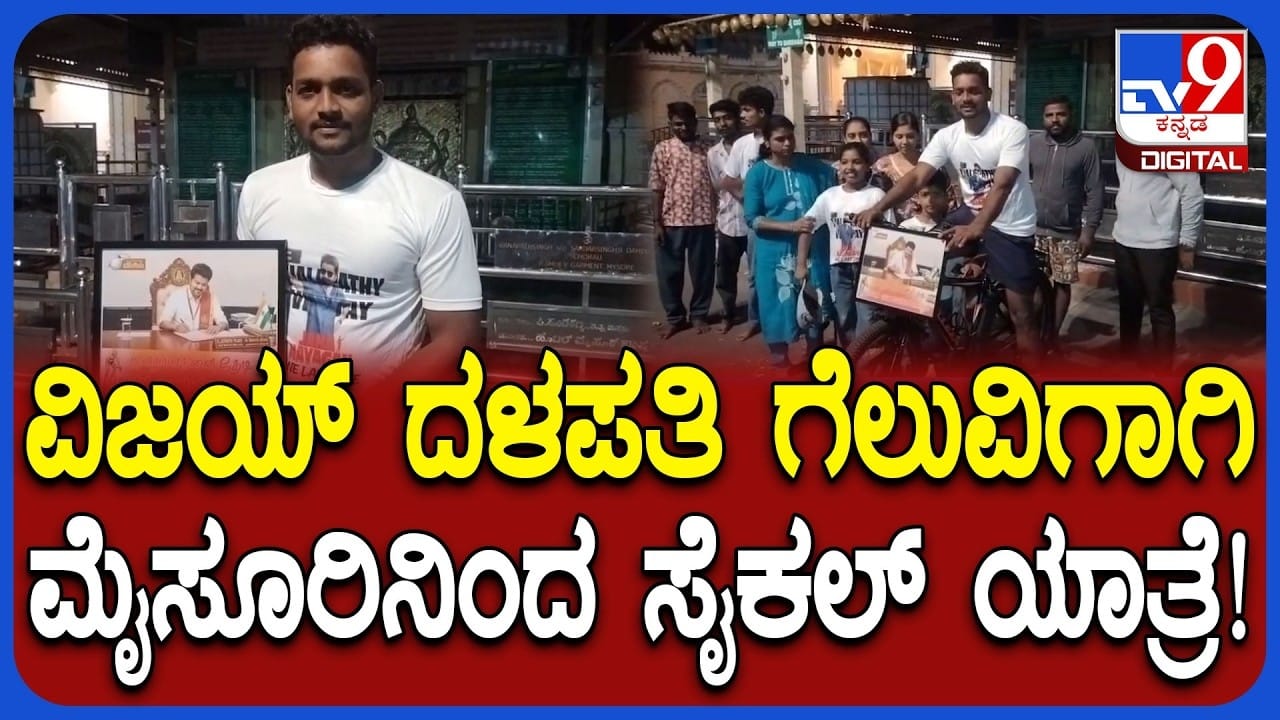 ತಮಿಳು ಚಿತ್ರರಂಗದ ಸೂಪರ್ ಸ್ಟಾರ್ ದಳಪತಿ ವಿಜಯ್ (Thalapathy Vijay) ಅವರು ರಾಜಕೀಯಕ್ಕೆ ಧುಮುಕಿದ್ದು ಟಿವಿಕೆ ಹೆಸರಿನ ರಾಜಕೀಯ ಪಕ್ಷ ಸ್ಥಾಪಿಸಿ, ತಮಿಳುನಾಡು ಚುನಾವಣೆಗೆ ಸ್ಪರ್ಧಿಸುತ್ತಿದ್ದಾರೆ. ಭರ್ಜರಿಯಾಗಿ ರಾಜ್ಯದಾದ್ಯಂತ ಪ್ರಚಾರ ಮಾಡುತ್ತಿರುವ ದಳಪತಿ ವಿಜಯ್ ಅವರು ಖುದ್ದಾಗಿ ಎರಡು ಕ್ಷೇತ್ರಗಳಿಂದ ಚುನಾವಣೆಗೂ ಸಹ ಸ್ಪರ್ಧೆ ಮಾಡಿದ್ದಾರೆ. ದಳಪತಿ ವಿಜಯ್ ಅವರಿಗೆ ಉತ್ತಮ ಬೆಂಬಲ ತಮಿಳುನಾಡಿನಲ್ಲಿ ವ್ಯಕ್ತವಾಗುತ್ತಿದೆ. ಇದೀಗ ಮೈಸೂರಿನಿಂದ ಅರುಳ್ ಸೆಲ್ವಂ ಹೆಸರಿನ ಯುವಕ ಸೈಕಲ್ ಯಾತ್ರೆ ಮಾಡಿಕೊಂಡು ತಮಿಳುನಾಡಿಗೆ ಹೋಗಿ ವಿಜಯ್ಗೆ ಬೆಂಬಲ ಸೂಚಿಸಲಿದ್ದಾರೆ. ಇಲ್ಲಿದೆ ನೋಡಿ ವಿಡಿಯೋ…