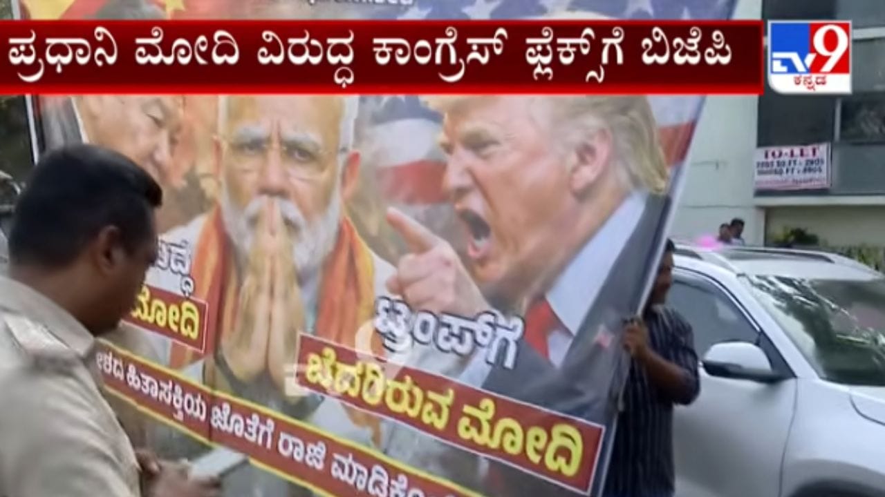 ಪ್ರಧಾನಿ ನರೇಂದ್ರ ಮೋದಿ ವಿರುದ್ಧ ಕಾಂಗ್ರೆಸ್ ಪಕ್ಷದವರು ಬೆಂಗಳೂರಿನಲ್ಲಿ ಹಾಕಿದ ಫ್ಲೆಕ್ಸ್ಗಳಿಗೆ ಬಿಜೆಪಿ ಆಕ್ರೋಶ ವ್ಯಕ್ತಪಡಿಸಿ, ಪೊಲೀಸ್ ದೂರು ದಾಖಲಿಸಿದೆ. ಅಮೆರಿಕ ಜತೆ ವ್ಯಾಪಾರ ಒಪ್ಪಂದ ಮಾಡಿಕೊಂಡ ವಿಚಾರವಾಗಿ ಅಲ್ಲಿನ ಅಧ್ಯಕ್ಷ ‘ಡೊನಾಲ್ಡ್ ಟ್ರಂಪ್ಗೆ ಹೆದರಿದ ಮೋದಿ’ ಎಂದು ಫ್ಲೆಕ್ಸ್ಗಳನ್ನು ಹಾಕಲಾಗಿತ್ತು. ಇದರ ವಿರುದ್ಧ ಬಿಜೆಪಿ ಕಿಡಿಕಾರಿದೆ.
