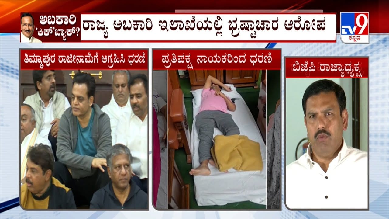 ರಾಜ್ಯ ಅಬಕಾರಿ ಇಲಾಖೆಯಲ್ಲಿ ಭ್ರಷ್ಟಾಚಾರ ನಡೆದಿದೆ ಎಂದು ಆರೋಪಿಸಿ, ಸಚಿವ ಆರ್.ಬಿ.ತಿಮ್ಮಾಪುರ ರಾಜೀನಾಮೆಗೆ ಆಗ್ರಹಿಸಿ ಬಿಜೆಪಿ ಮತ್ತು ಜೆಡಿಎಸ್ ಪಕ್ಷಗಳು ವಿಧಾನಸೌಧದಲ್ಲಿ ಅಹೋರಾತ್ರಿ ಧರಣಿ ನಡೆಸಿವೆ. ಅಹೋರಾತ್ರಿ ಧರಣಿ ಕೈಬಿಡುವಂತೆ ಸ್ಪೀಕರ್ ಯು.ಟಿ.ಖಾದರ್ ಮನವಿ ಹೊರತಾಗಿಯೂ ಸರ್ಕಾರದ ವಿರುದ್ಧ ಧಿಕ್ಕಾರ ಕೂಗಿ ಮೈತ್ರಿ ಪಕ್ಷಗಳ ಸದಸ್ಯರು ಪ್ರತಿಭಟನೆ ನಡೆಸಿದ್ದಾರೆ.