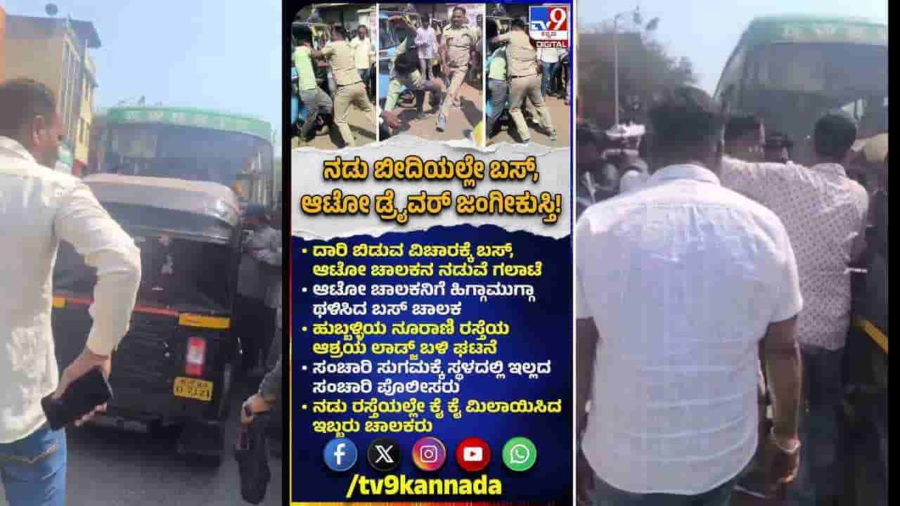 ದಾರಿ ಬಿಡುವ ವಿಚಾರಕ್ಕೆ ಬಸ್ ಚಾಲಕ ಹಾಗೂ ಆಟೋ ಚಾಲಕನ ಪರಸ್ಪರ ಹೊಡೆದಾಡಿಕೊಂಡಿರುವ ಘಟನೆ ಹುಬ್ಬಳ್ಳಿಯ ನೂರಾಣಿ ರಸ್ತೆಯ ಆಶ್ರಯ ಲಾಡ್ಜ್ ಬಳಿ ನಡೆದಿದೆ. ಬಸ್ ಹಾಗೂ ಆಟೋ ಹುಬ್ಬಳ್ಳಿಯ ನೂರಾಣಿ ರಸ್ತೆಯ ಆಶ್ರಯ ಲಾಡ್ಜ್ ಬಳಿ ಎದುರು ಬದುರಾಗಿ ಬಂದು ನಿಂತಿದ್ದು, ದಾರಿ ಬಿಡುವ ವಿಚಾರಕ್ಕೆ ಗಲಾಟೆಯಾಗಿದೆ. ಮಾತಿಗೆ ಮಾತು ಬೆಳೆದು ಹೊಡೆದಾಟ ತನಕ ಹೋಗಿದ್ದು, ಬಸ್ ಚಾಲಕ, ಆಟೋ ಚಾಲಕನಿಗೆ ಹಿಗ್ಗಾಮುಗ್ಗಾ ಥಳಿಸಿದ್ದಾನೆ. ಇದರಿಂದ ಟ್ರಾಪಿಕ್ ಜಾಮ್ ಉಂಟಾಗಿದ್ದರೂ ಸಹ ಸ್ಥಳಕ್ಕೆ ಪೊಲೀಸರ ಬರಲೇ ಇಲ್ಲ. ಇನ್ನು ಸ್ಥಳೀಯರು ಜಗಳ ಬಿಡಿಸಲು ಹರಸಾಹಸಪಟ್ಟಿದ್ದಾರೆ.