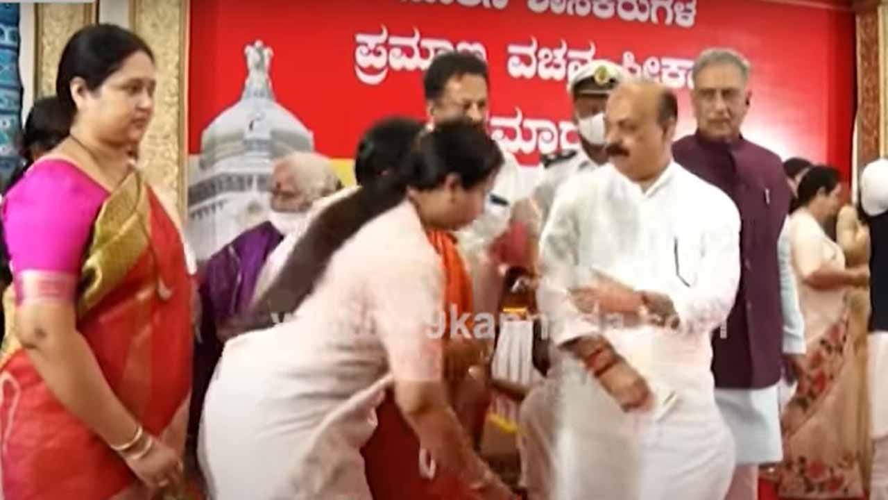 ಪರಿಷತ್ ಸದಸ್ಯರ ಪ್ರತಿಜ್ಞಾವಿಧಿ ಸ್ವೀಕಾರ ಕಾರ್ಯಕ್ರಮದಲ್ಲಿ ಲಕ್ಷ್ಮಿ ಹೆಬ್ಬಾಳ್ಕರ್ ಮುಖ್ಯಮಂತ್ರಿಗಳ ಕಾಲುಮುಟ್ಟಿ ನಮಸ್ಕರಿಸಿ ಗಮನ ಸೆಳೆದರು