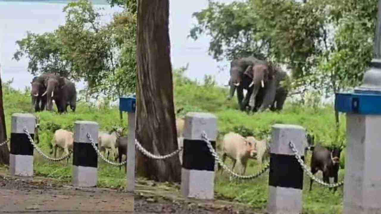 ಕಾಡಿನಿಂದ ನಾಡಿಗೆ ಬಂದ ಆನೆಗಳು: ಗಜರಾಜರನ್ನು ಕಂಡು ದಿಕ್ಕಾಪಾಲಾಗಿ ಓಡಿದ ಹಸುಗಳು
