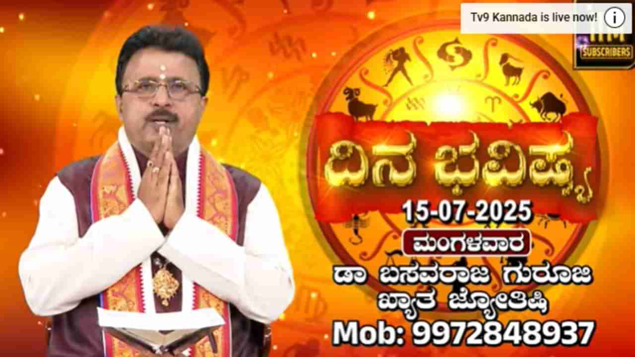 ಇಂದು ತಾರೀಖು 15-7-2025 ಮಂಗಳವಾರ ವಿಶ್ವಾವಸು ನಾಮ ಸಂವಸರ, ಉತ್ತರಾಯಣ, ಆಷಾಢ ಮಾಸ, ಗ್ರೀಷ್ಮ ಋತು, ಕೃಷ್ಣ, ಪಕ್ಷ ಪಂಚಮಿ, ಶತಭಿಷ ನಕ್ಷತ್ರ, ಸೌಭಾಗ್ಯ ಯೋಗ, ಕೌಲವಕರಣ ಇರತಕ್ಕಂತಹ ಈ ದಿನದ ರಾಹುಕಾಲ 3.36 ರಿಂದ 5.12 ರ ತನಕ ಇರಲಿದೆ. ಸರ್ವಸಿದ್ಧಿ ಕಾಲ, ಸಂಕಲ್ಪ ಕಾಲ, ಶುಭಕಾಲ 10.49 ರಿಂದ 12.25 ನಿಮಿಷದ ತನಕ ಇರಲಿದೆ. ದ್ವಾದಶ ರಾಶಿಗಳ ಫಲಾಫಲವನ್ನು ಖ್ಯಾತ ಜ್ಯೋತಿಷಿ ಮತ್ತು ವಾಸ್ತು ಶಾಸ್ತ್ರಜ್ಞ ಡಾ ಬಸವರಾಜ ಗುರೂಜಿ ಇಲ್ಲಿ ವಿವರಿಸಿದ್ದಾರೆ.