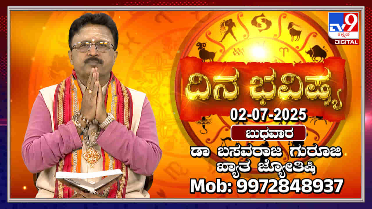 ಬೆಂಗಳೂರು, ಜುಲೈ 02: ಬುಧವಾರದ ದಿನದ 12 ರಾಶಿಗಳ ಫಲಾಫಲಗಳನ್ನು ವಿವರಿಸಿದ್ದಾರೆ. ಇಂದು ವೈವಸ್ವತ ಸಪ್ತಮಿ ಎಂಬ ಪರ್ವದ ದಿನವಾಗಿದ್ದು, ವೆಂಕಟೇಶ್ವರ, ವಿನಾಯಕ ಮತ್ತು ಕಾಲಭೈರವರ ಲಹರಿಗಳಿರುವ ವಿಶೇಷ ದಿನವಾಗಿದೆ. ಖ್ಯಾತ ಜ್ಯೋತಿಷಿ ಡಾ. ಬಸವರಾಜ ಗುರೂಜಿ ಪ್ರತಿ ರಾಶಿಗೂ ಶುಭ ದಿಕ್ಕು, ಅದೃಷ್ಟ ಸಂಖ್ಯೆ ಮತ್ತು ಶುಭ ಬಣ್ಣವನ್ನು ವಿಡಿಯೋದಲ್ಲಿ ಸೂಚಿಸಿದ್ದಾರೆ.