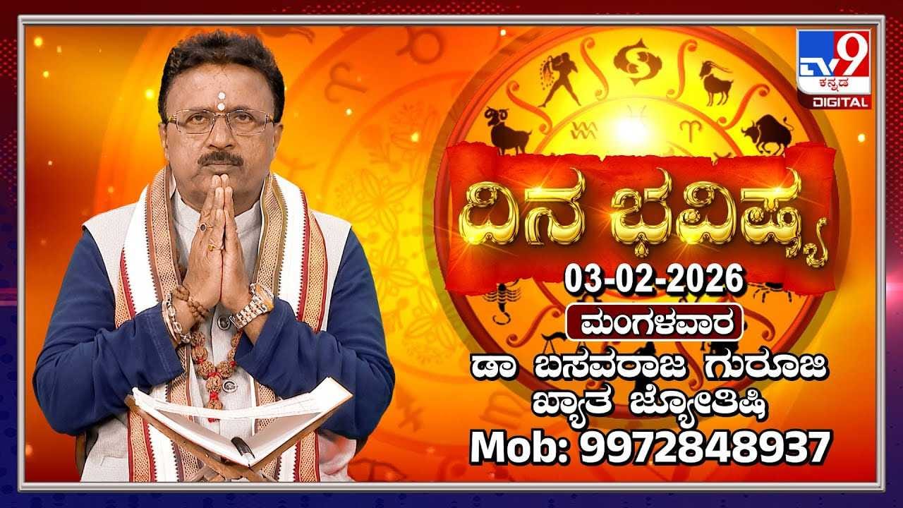 ಖ್ಯಾತ ಜ್ಯೋತಿಷಿ ಡಾ. ಬಸವರಾಜ ಗುರೂಜಿ ಅವರು 03 ಫೆಬ್ರುವರಿ 2026 ರ ದ್ವಾದಶ ರಾಶಿಗಳ ಫಲಾಫಲವನ್ನು ಪ್ರಸ್ತುತಪಡಿಸಿದ್ದಾರೆ. ಈ ದಿನ ಮಂಗಳವಾರವಾಗಿದ್ದು, ವಿಶ್ವಾವಸುನಾಮ ಸಂವತ್ಸರ, ಉತ್ತರಾಯಣ, ಮಾಘ ಮಾಸ, ಶಿಶಿರ ಋತು, ಕೃಷ್ಣ ಪಕ್ಷ, ಬಿದಿಗೆ ತಿಥಿ, ಮಖಾ ನಕ್ಷತ್ರದಲ್ಲಿ ಚಂದ್ರ ಸಂಚರಿಸುತ್ತಿರುವ ಈ ದಿನದಂದು, ರವಿ ಮಕರ ರಾಶಿಯಲ್ಲಿ ಮತ್ತು ಚಂದ್ರ ಸಿಂಹ ರಾಶಿಯಲ್ಲಿ ಇರಲಿದೆ.