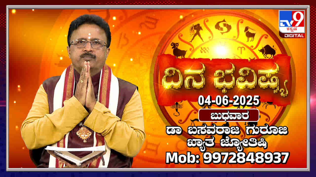 ಇಂದಿನ ದಿನಭವಿಷ್ಯ ಕಾರ್ಯಕ್ರಮದಲ್ಲಿ ಖ್ಯಾತ ಜ್ಯೋತಿಷಿ ಡಾ. ಬಸವರಾಜ ಗುರೂಜಿ ಜೂನ್ 4ರ ದಿನದ ಎಲ್ಲಾ ರಾಶಿಗಳ ಫಲವನ್ನು ವಿವರಿಸಿದ್ದಾರೆ. ಪ್ರತಿಯೊಂದು ರಾಶಿಯವರಿಗೂ ಆ ದಿನದ ಶುಭ ಅಶುಭ ಫಲಗಳು, ಅದೃಷ್ಟ ಸಂಖ್ಯೆಗಳು ಮತ್ತು ಶುಭ ದಿಕ್ಕುಗಳ ಮಾಹಿತಿಯನ್ನು ಒಳಗೊಂಡಿದೆ. ವಿಡಿಯೋ ನೋಡಿ.