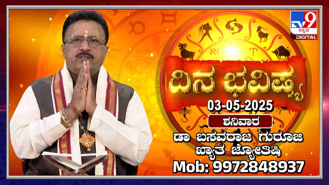 ಬೆಂಗಳೂರು, ಮೇ 03: ಖ್ಯಾತ ಜ್ಯೋತಿಷಿ ಡಾ. ಬಸವರಾಜ ಗುರೂಜಿ 12 ರಾಶಿಗಳ ಫಲಗಳನ್ನು ವಿವರಿಸಿದ್ದಾರೆ. ಮೇಷ ರಾಶಿಯವರಿಗೆ ವೃತ್ತಿಯಲ್ಲಿ ಯಶಸ್ಸು, ವಾಹನ ಯೋಗ ಮತ್ತು ಕುಟುಂಬದಲ್ಲಿ ಸಂತೋಷದ ವಾತಾವರಣವಿರುತ್ತದೆ. ವೃಷಭ ರಾಶಿಯವರಿಗೆ ಆಕಸ್ಮಿಕ ಧನ ಲಾಭ ಮತ್ತು ಆರೋಗ್ಯದಲ್ಲಿ ಉತ್ತಮ ಸುಧಾರಣೆ ಕಂಡುಬರಲಿದೆ. ಅದೇ ರೀರಿಯಾಗಿ ಪ್ರತಿಯೊಂದು ರಾಶಿಗೂ ಅದೃಷ್ಟ ಸಂಖ್ಯೆ ಮತ್ತು ಶುಭ ಬಣ್ಣಗಳನ್ನು ಸೂಚಿಸಿ, ಸೂಕ್ತ ಮಂತ್ರ ಪಠಣವನ್ನು ಸೂಚಿಸಲಾಗಿದೆ.