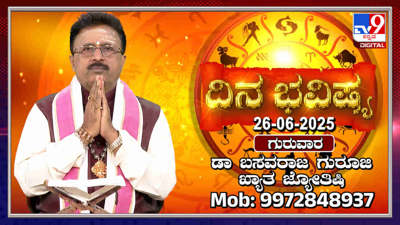ಜೂನ್ 26ರ ದಿನದ ರಾಶಿ ಫಲಗಳನ್ನು ಡಾ. ಬಸವರಾಜ ಗುರೂಜಿ ವಿವರಿಸಿದ್ದಾರೆ. ಮೇಷ, ವೃಷಭ ಮತ್ತು ಮಿಥುನ ರಾಶಿಯವರಿಗೆ ಆರ್ಥಿಕ ಲಾಭ, ಉದ್ಯೋಗದಲ್ಲಿ ಪ್ರಗತಿ, ಮತ್ತು ಕುಟುಂಬದಲ್ಲಿ ಸಂತೋಷದ ಮನೆ ಮಾಡಲಿದೆ. ಪ್ರತಿಯೊಂದು ರಾಶಿಗೆ ಸೂಕ್ತ ಬಣ್ಣ ಮತ್ತು ದಿಕ್ಕನ್ನು ಸೂಚಿಸಲಾಗಿದೆ. ಅದೃಷ್ಟ ಸಂಖ್ಯೆಗಳನ್ನೂ ತಿಳಿಸಲಾಗಿದೆ.