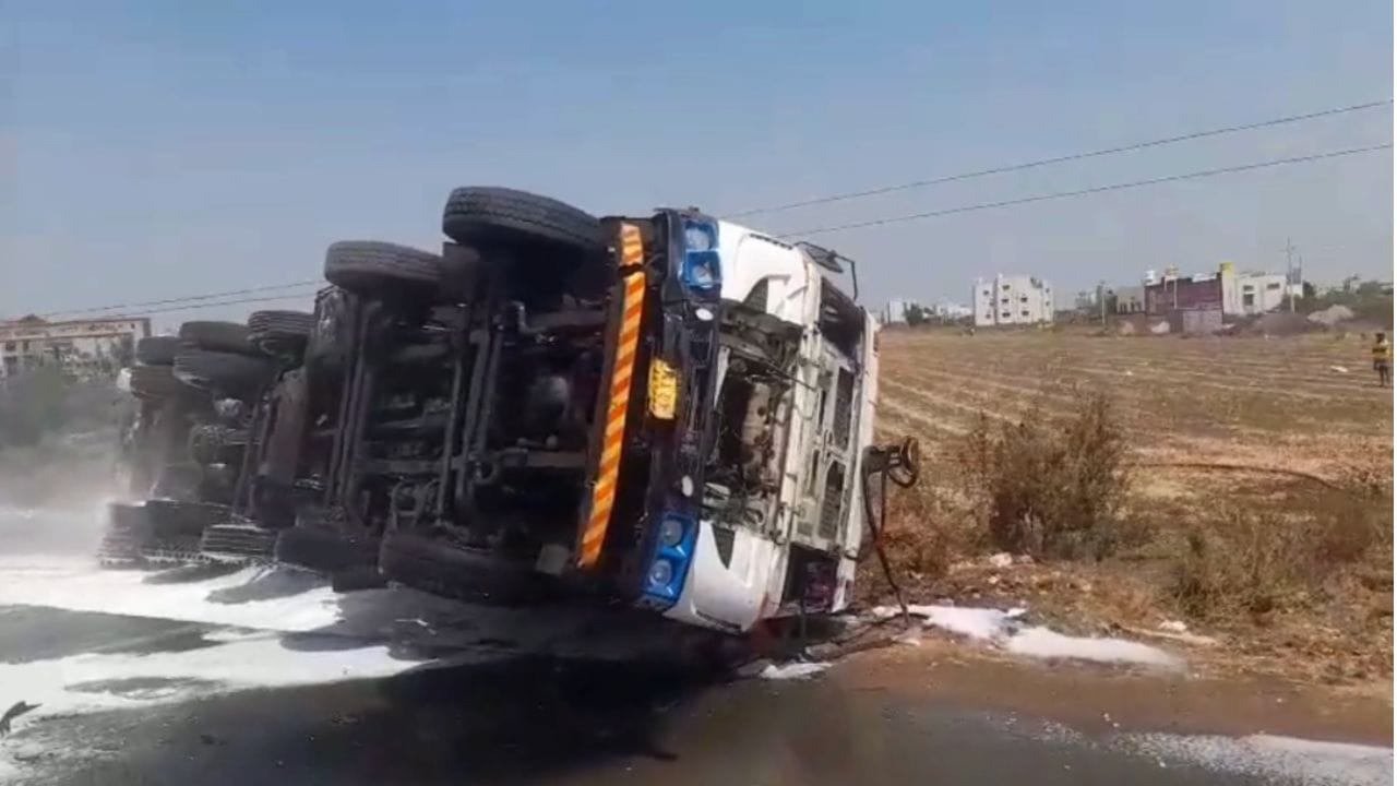 ಎಥೆನಾಲ್ ಸಾಗಿಸುತ್ತಿದ್ದ ಟ್ಯಾಂಕರ್ ಪಲ್ಟಿ: ಕ್ಷಣಾರ್ಧದಲ್ಲಿ ಧಗಧಗಿಸಿದ ಬೆಂಕಿ