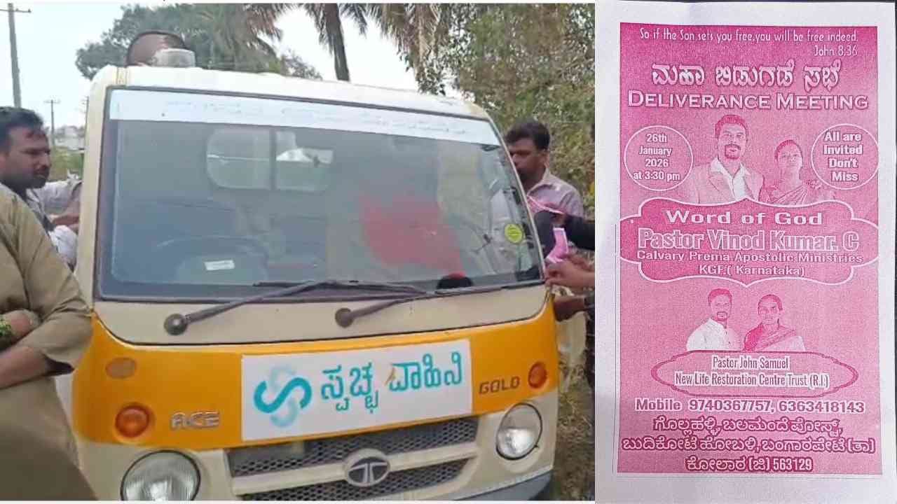 ಧರ್ಮ ಪ್ರಚಾರ ವಾಹನವಾದ ಪಂಚಾಯ್ತಿ ಸ್ವಚ್ಚತಾ ವಾಹನ: ಕಸ ಸಂಗ್ರಹಿಸುತ್ತ ಸಿಬ್ಬಂದಿಯಿಂದ ಕರಪತ್ರ ಹಂಚಿಕೆ