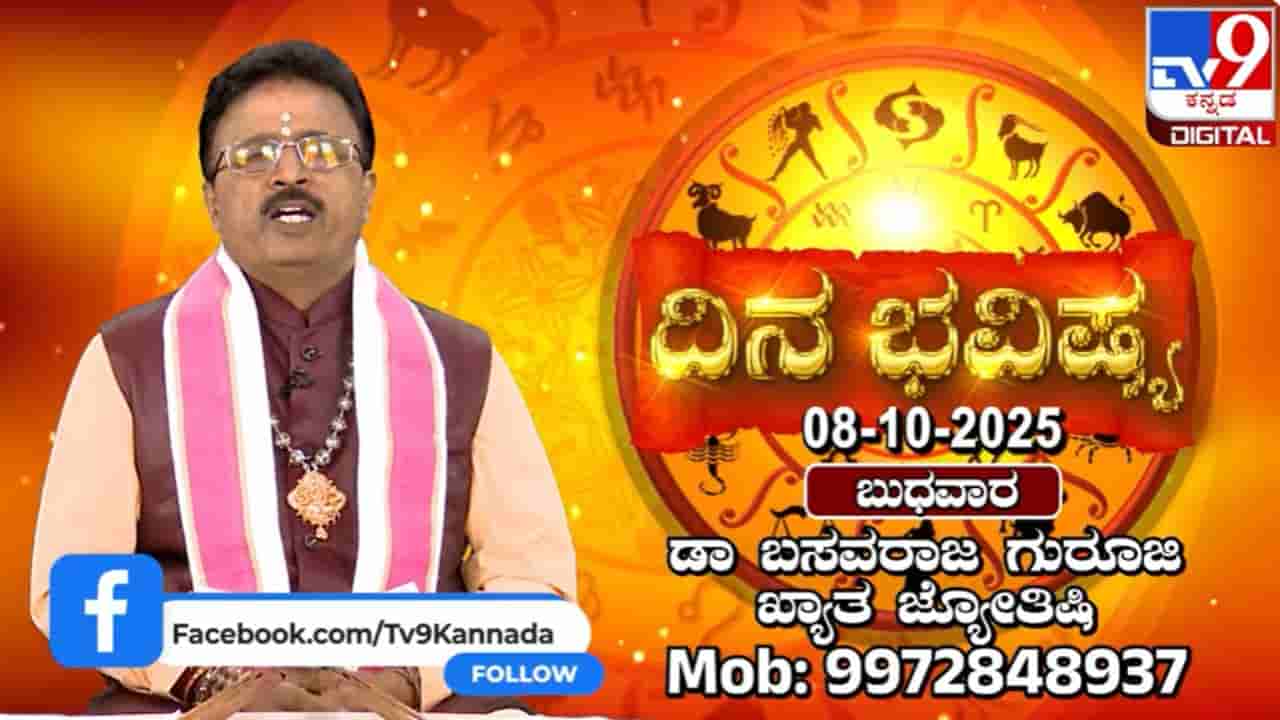 ಅಕ್ಟೋಬರ್ 8, ಬುಧವಾರ, ದಕ್ಷಿಣಾಯಣ, ಶರದ್ ಋತುವಿನ ಆಶ್ವಯುಜ ಮಾಸ,ಕೃಷ್ಣ ಪಕ್ಷದ ಪಾಡ್ಯ ತಿಥಿ, ಯೋಗ ಅರ್ಶನ, ಕೌಲವ ಕರಣವಿರುವ ಇಂದಿನ ದ್ವಾದಶ ರಾಶಿಗಳ ಫಲಾಫಲಗಳನ್ನು ಖ್ಯಾತ ಜ್ಯೋತಿಷಿ ಮತ್ತು ವಾಸ್ತು ಶಾಸ್ತ್ರಜ್ಞ ಡಾ ಬಸವರಾಜ ಗುರೂಜಿ ತಿಳಿಸಿಕೊಟ್ಟಿದ್ದಾರೆ. ಸ್ವಯಂ ಪ್ರಜ್ಞೆ, ಸಂಗಾತಿಯ ದೂರು, ಕಾರ್ಯದಲ್ಲಿ ಗೊಂದಲ, ಹಕ್ಕಿನ ಚಲಾವಣೆ, ವೃತ್ತಿಯ ಸ್ಥಳ ಬದಲು ಇವೆಲ್ಲ ನಿರ್ದಿಷ್ಠ ರಾಶಿಯವರಿಗೆ ಸಂಬಂಧಿಸಿದ್ದೇ ಇಂದಿನ ವಿಶೇಷ.