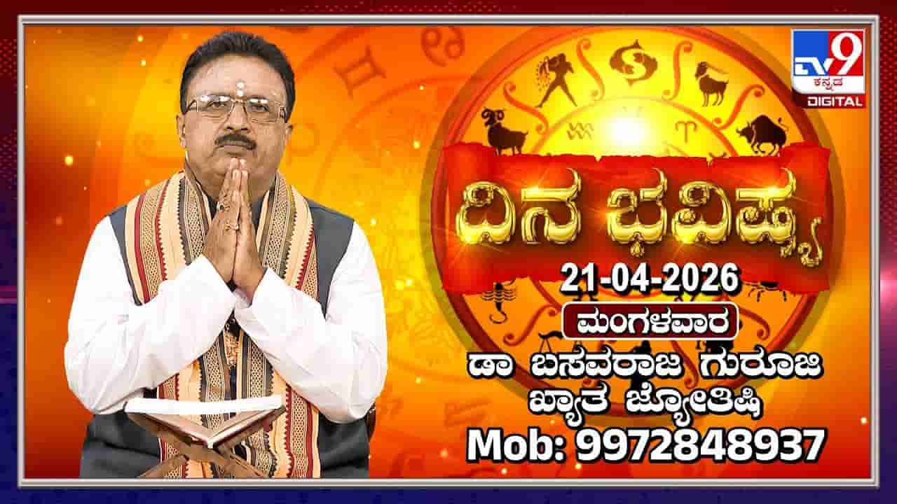 ಟಿವಿ9 ಡಿಜಿಟಲ್ ವಾಹಿನಿಯಲ್ಲಿ ಪ್ರಸಾರವಾದ ದಿನಭವಿಷ್ಯ ಕಾರ್ಯಕ್ರಮದಲ್ಲಿ ಖ್ಯಾತ ಜ್ಯೋತಿಷಿ ಡಾ. ಬಸವರಾಜ ಗುರೂಜಿ ಅವರು ಏಪ್ರಿಲ್ 21, ಮಂಗಳವಾರದ ದ್ವಾದಶ ರಾಶಿಗಳ ಫಲಾಫಲಗಳನ್ನು ವಿವರಿಸಿದ್ದಾರೆ. ಇದು ಪರಾಭವನಾಮ ಸಂವತ್ಸರ, ಉತ್ತರಾಯಣ, ವೈಶಾಖ ಮಾಸ, ವಸಂತ ಋತು, ಶುಕ್ಲ ಪಕ್ಷ, ಚೌತಿ ತಿಥಿ, ರೋಹಿಣಿ ನಕ್ಷತ್ರ, ಶೋಭನ ಯೋಗ ಮತ್ತು ಭದ್ರಕರಣದಿಂದ ಕೂಡಿದೆ. ಗುರೂಜಿ ಅವರು ಪ್ರತಿ ರಾಶಿಯ ಆರ್ಥಿಕ ಸ್ಥಿತಿ, ಆರೋಗ್ಯ, ಉದ್ಯೋಗ, ಸಂಬಂಧಗಳು, ಶುಭಕಾರ್ಯಗಳು, ಅದೃಷ್ಟದ ಬಣ್ಣ, ದಿಕ್ಕು, ಸಂಖ್ಯೆ ಮತ್ತು ಜಪಿಸಬೇಕಾದ ಮಂತ್ರಗಳ ಕುರಿತು ವಿವರವಾದ ಭವಿಷ್ಯವನ್ನು ತಿಳಿಸಿದ್ದಾರೆ.